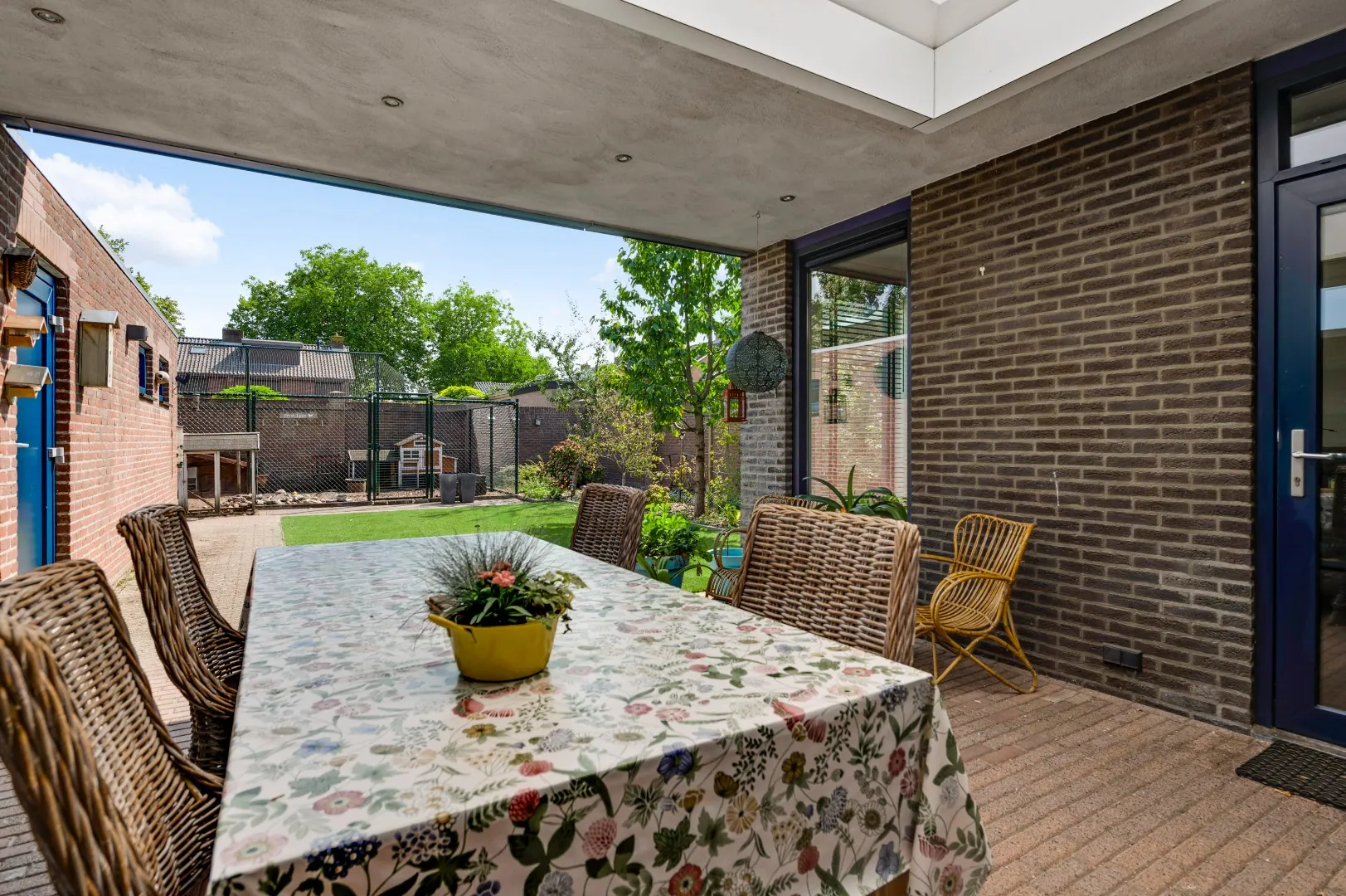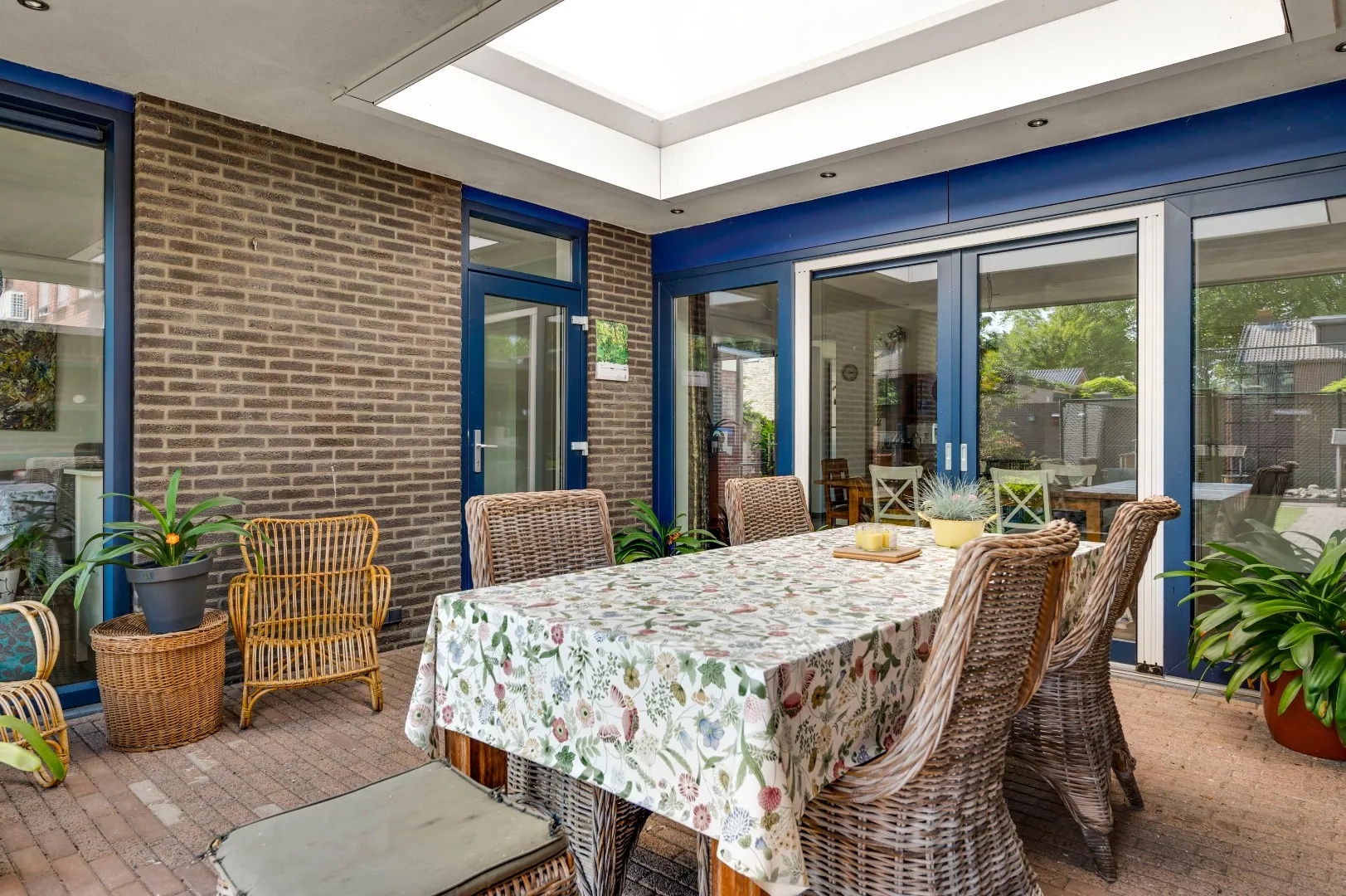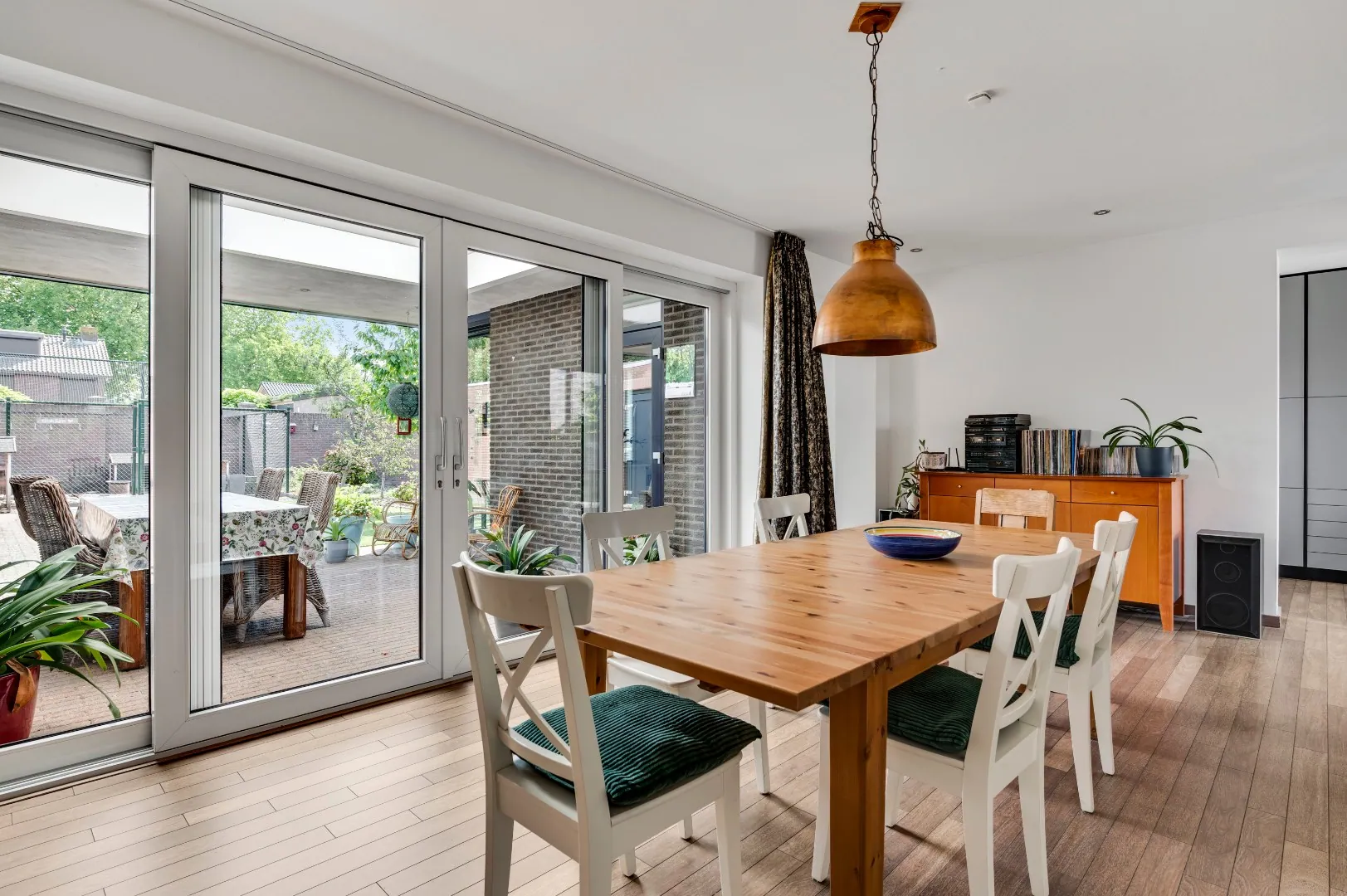 Zeer uitgebreide meterkast v.v. automaten. Doorgang naar living welke geheel op de tuin is gericht met volledig glas en brede kunststof schuifpui. Om nog meer van binnen en buiten te kunnen genieten is er in 2007 een grote tuinkamer aangebouwd, en deze extra ruimte heeft ook weer direct contact met het grote overdekte terras. Mooie doorlopende laminaatvloer (niet van echt te onderscheiden) en zowel de tuinkamer, woonkamer en werkkamer zijn v.v. wandverwarming!!