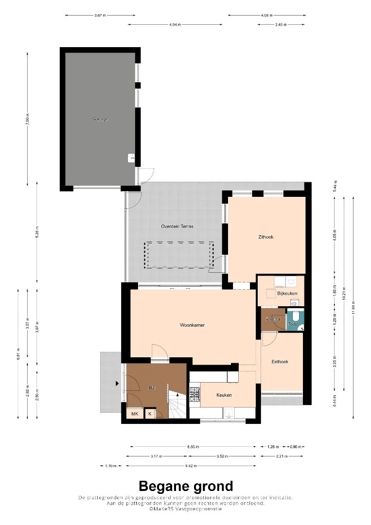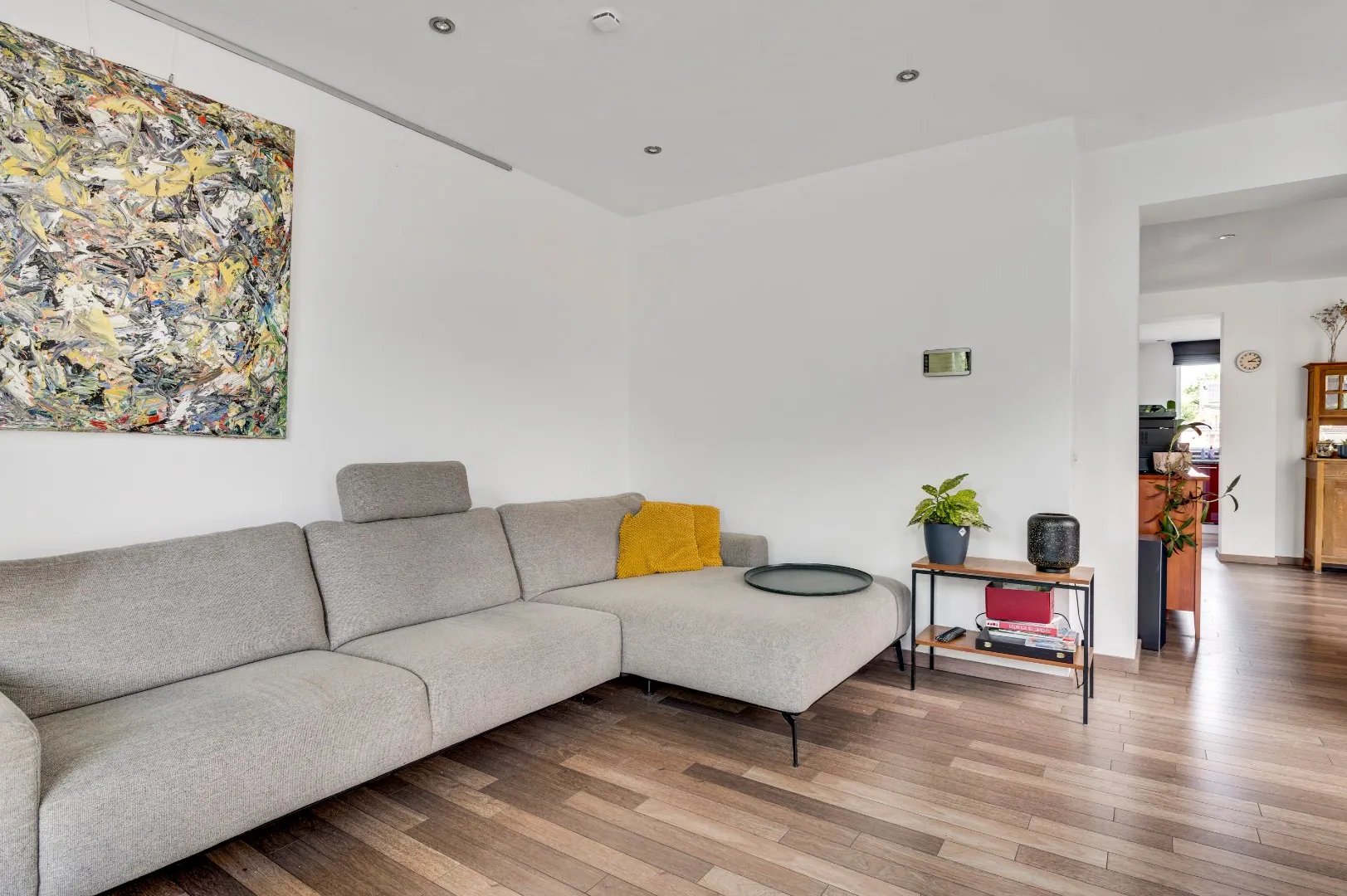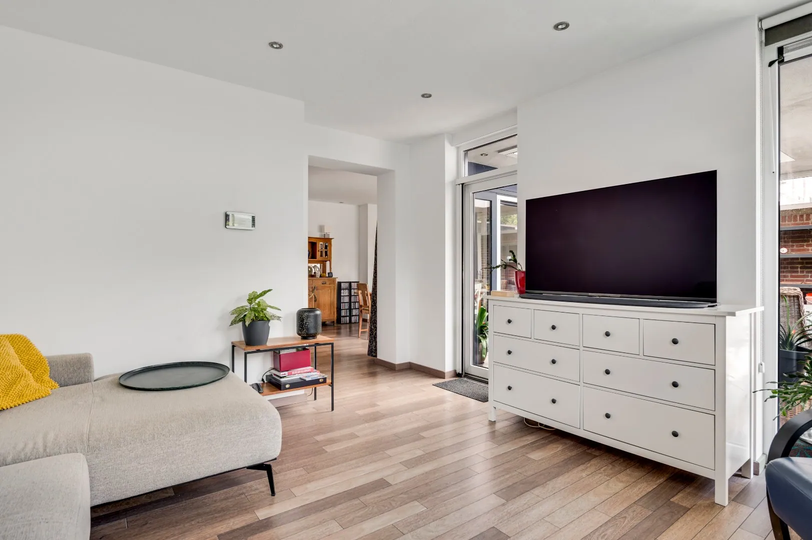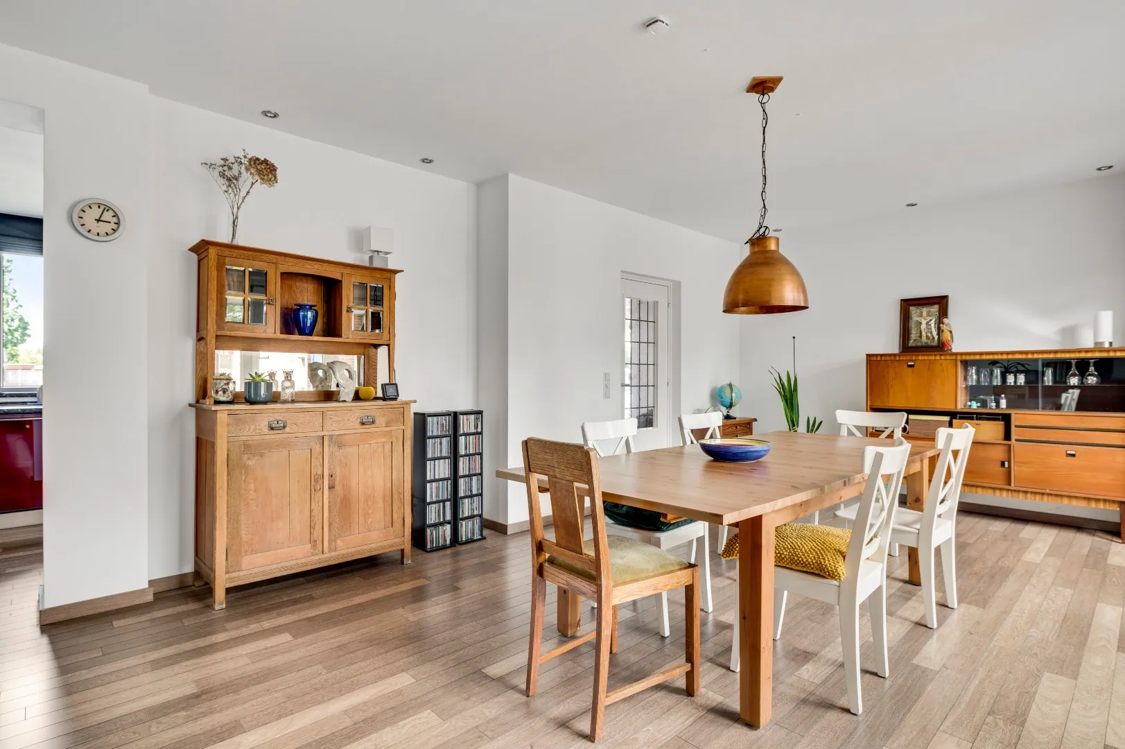 Zeer uitgebreide meterkast v.v. automaten. Doorgang naar living welke geheel op de tuin is gericht met volledig glas en brede kunststof schuifpui. Om nog meer van binnen en buiten te kunnen genieten is er in 2007 een grote tuinkamer aangebouwd, en deze extra ruimte heeft ook weer direct contact met het grote overdekte terras. Mooie doorlopende laminaatvloer (niet van echt te onderscheiden) en zowel de tuinkamer, woonkamer en werkkamer zijn v.v. wandverwarming!!