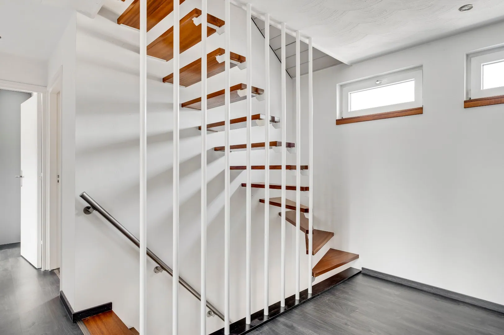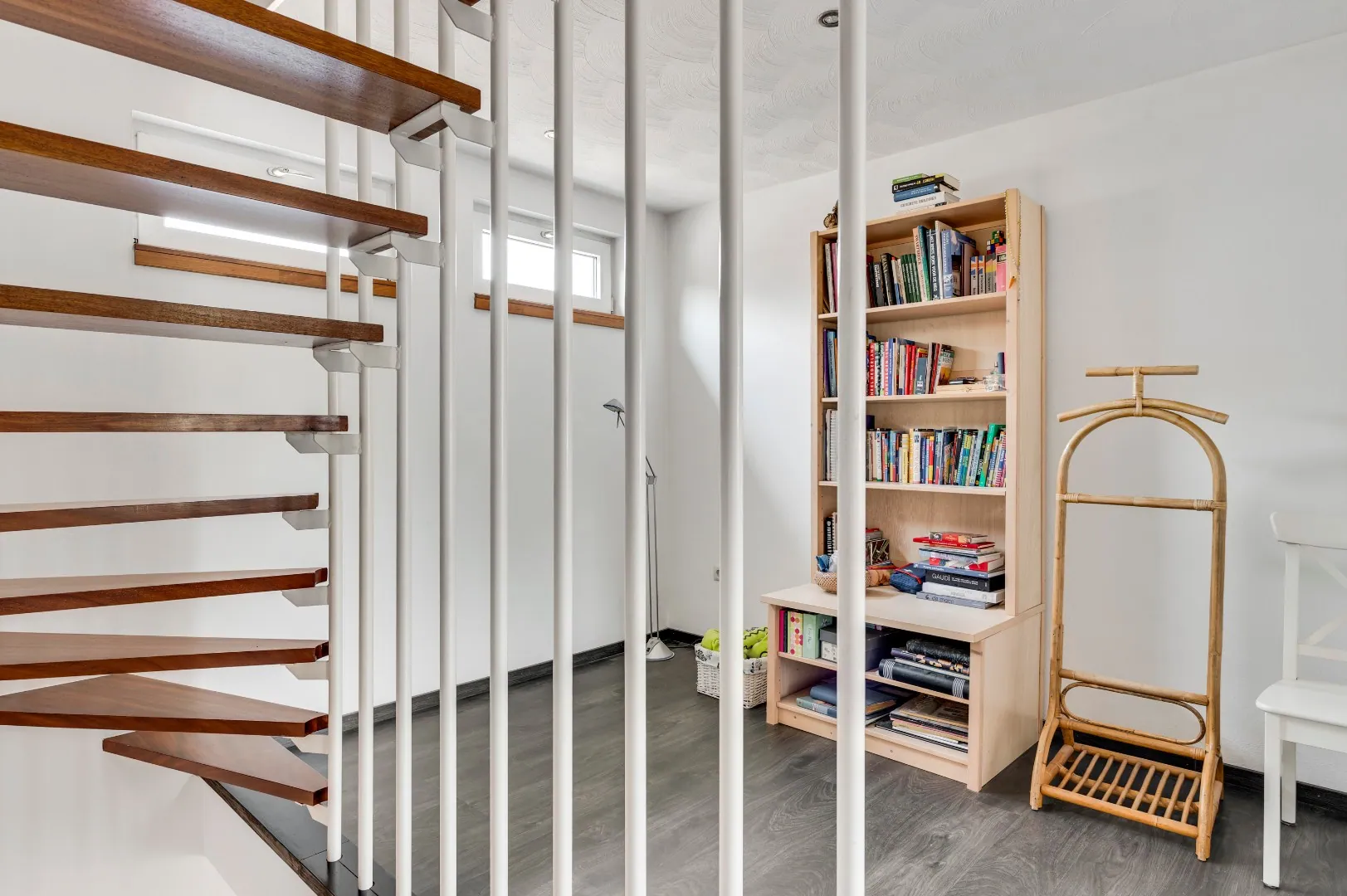De moderne trap brengt u naar de overloop, deze overloop is van een dusdanige afmeting dat er een complete werkplek kan landen.