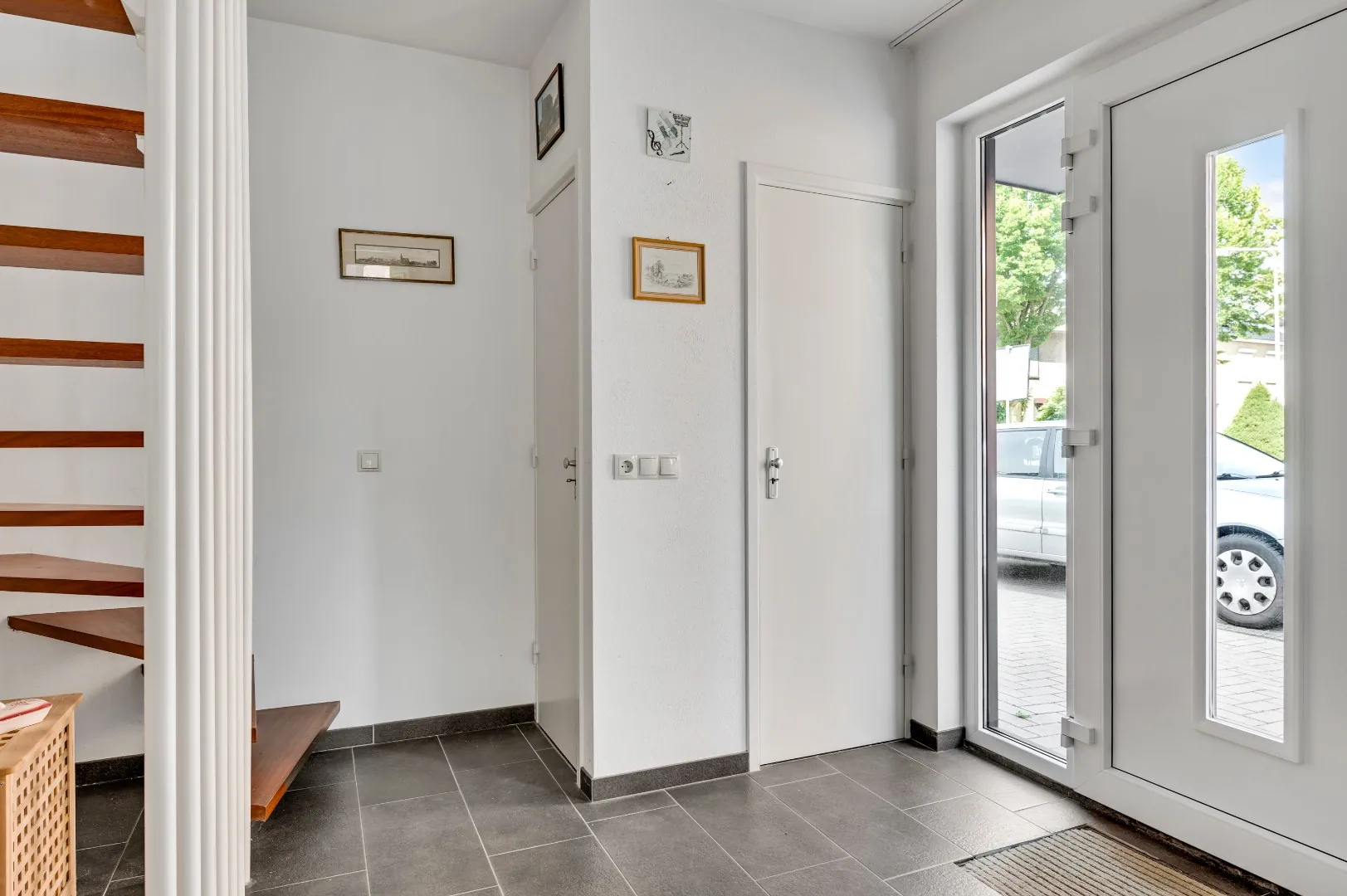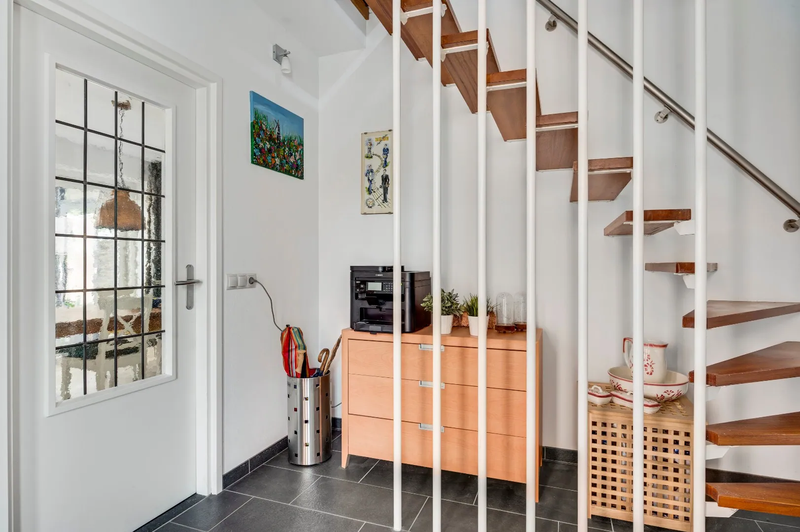 Via de riante oprit van 2023 bereikt u het gemoderniseerde entree. Prachtige onderhoudsvrije deur met extra raampartijen. De hal geeft direct de ruimte weer waarbij de moderne trap met hardhouten zwevende treden naar boven lonken.
