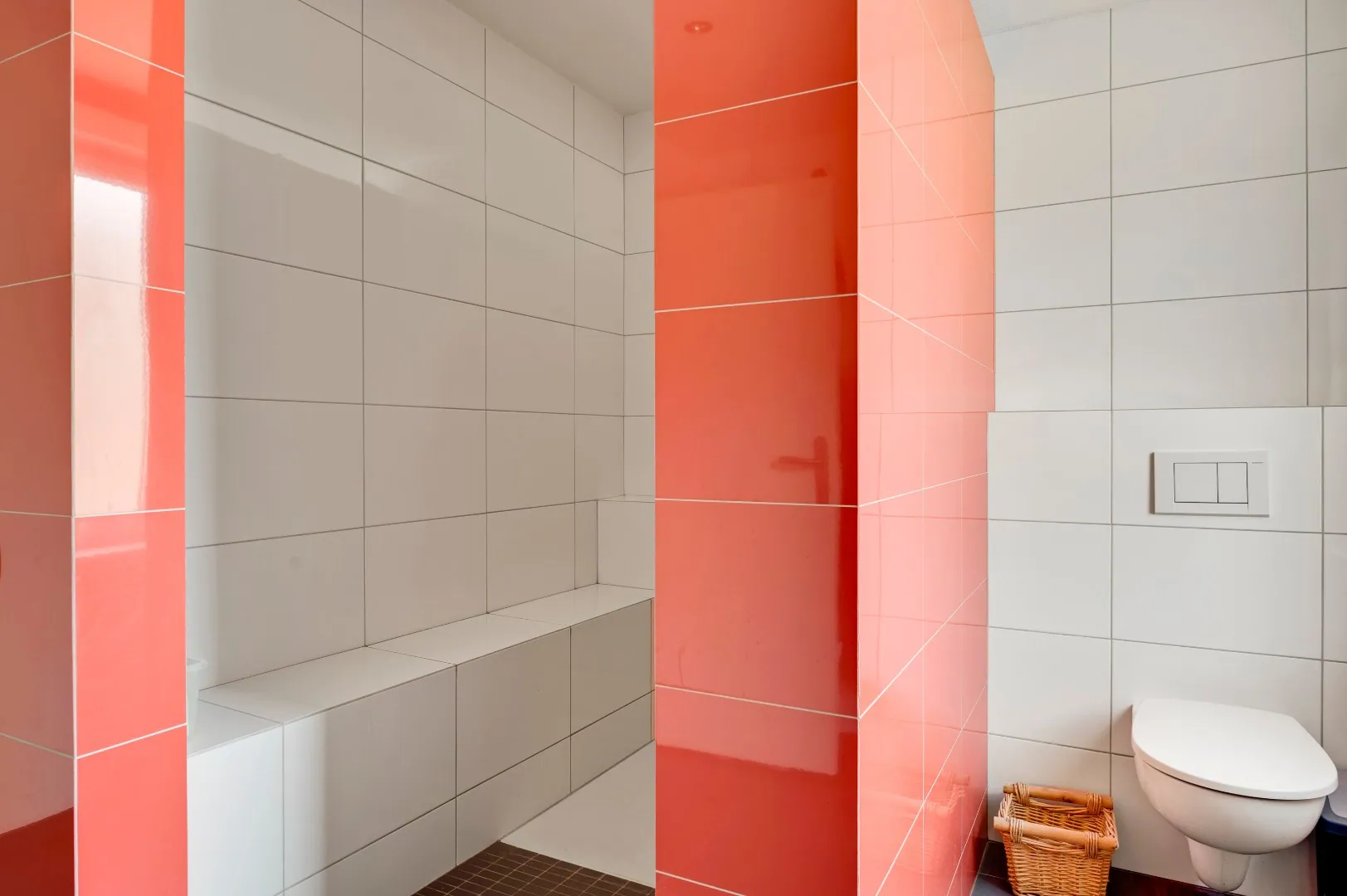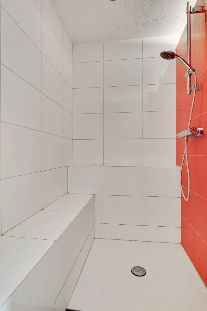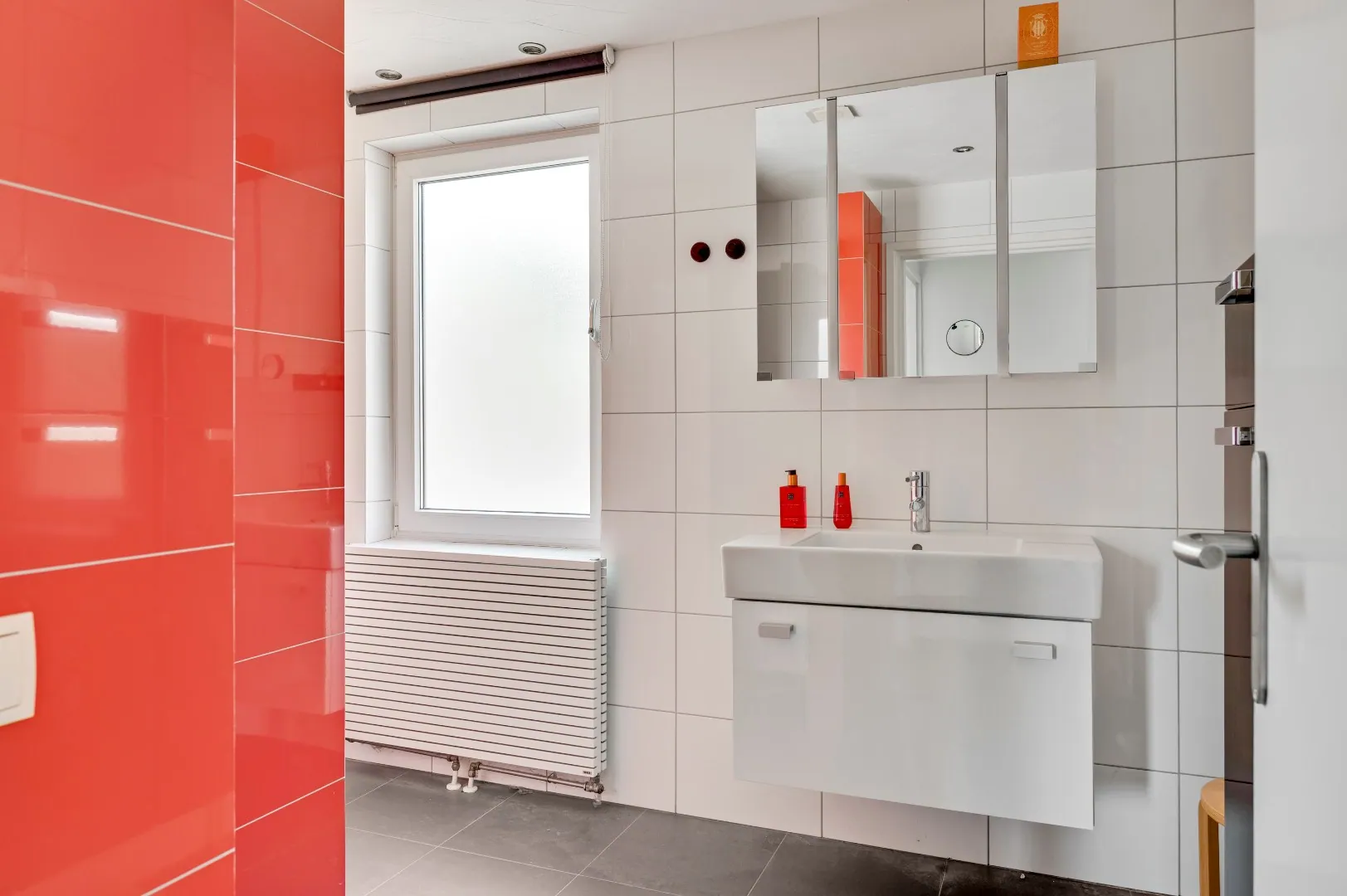 De badkamer verdient ook hier een bezichtiging, ruime inloopdouche met extra zit. Hangtoilet, modern wastafelcombinatie en raam in voorgevel.