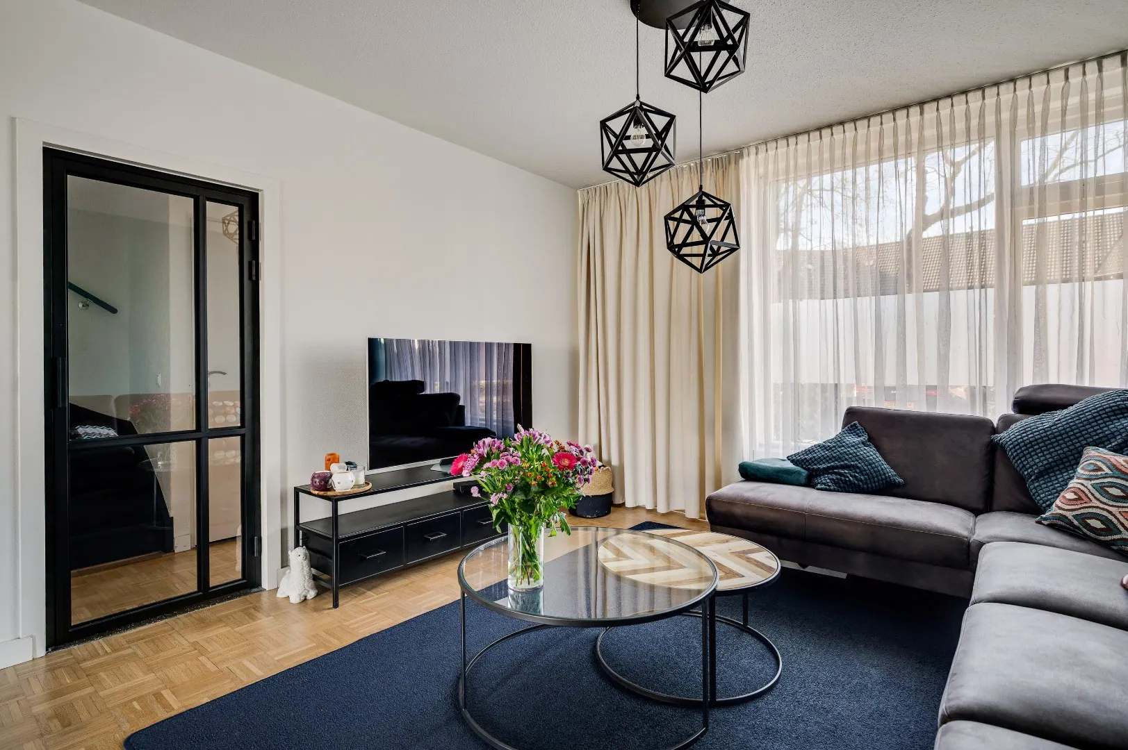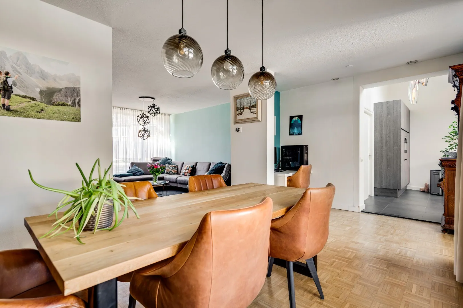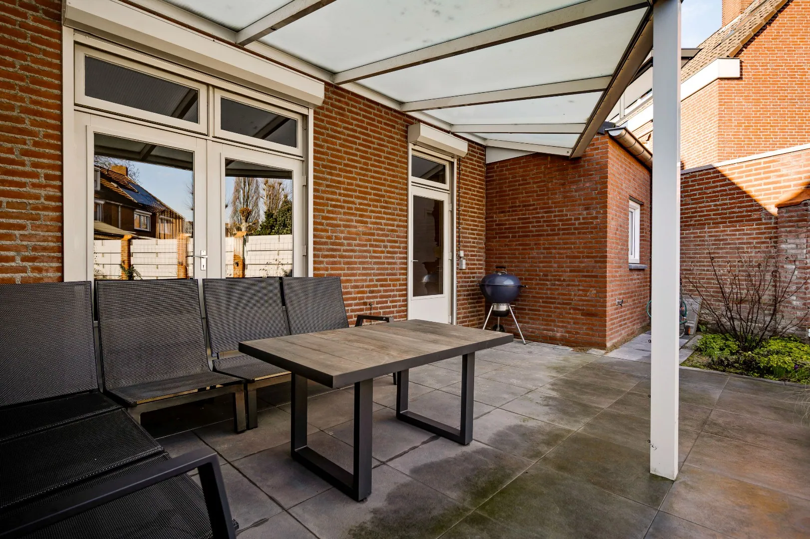 Aan het einde van de halpartij wordt u aangezogen door de moderne stalen glazen deuren naar de moderne living van maar liefst 37 m2 met keurig zicht over groen en aan de achterzijde over de eigen goed aangelegde tuin, openslaan de tuindeuren, met fantastische ruime overkapping.
