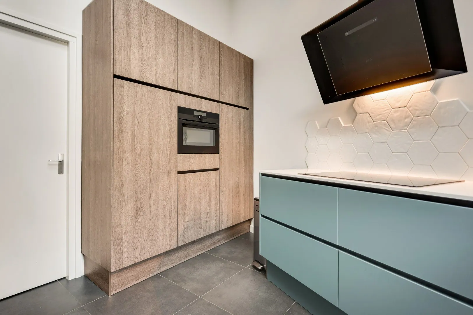 Zeer luxe keukenopstelling v.v. diverse keukenapparatuur, extra keukenwand, inductie kookplaat, afzuigkap, combi-magnetron, koelkast, vrieskast, vaatwasser, boiler en extra lus t.b.v. vloerverwarming.