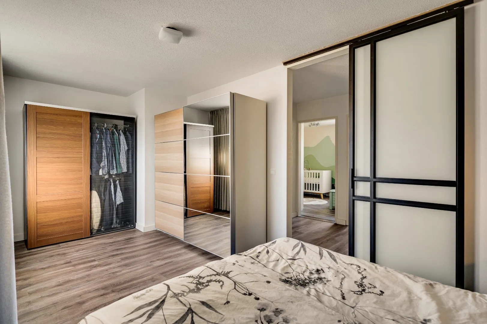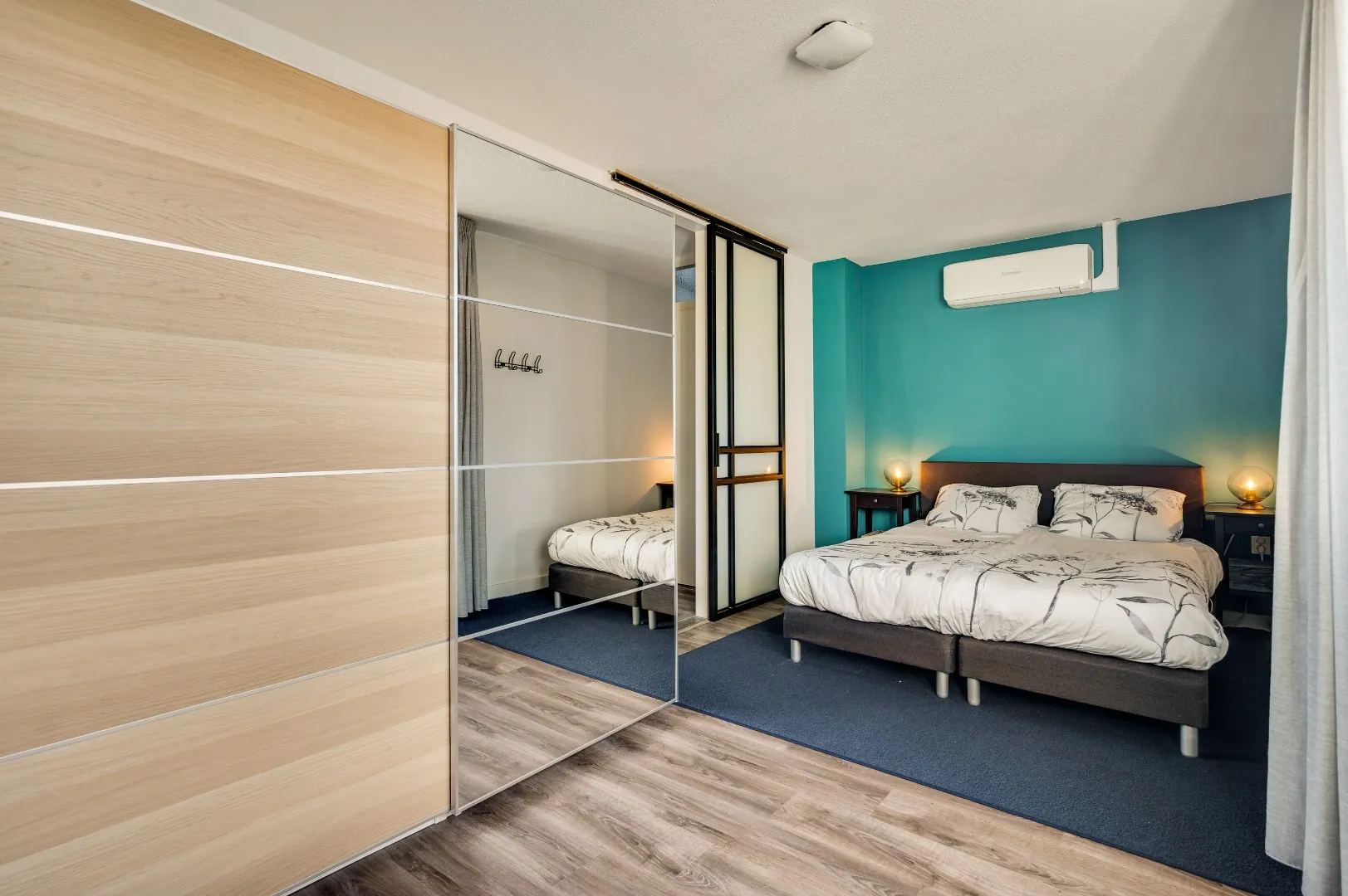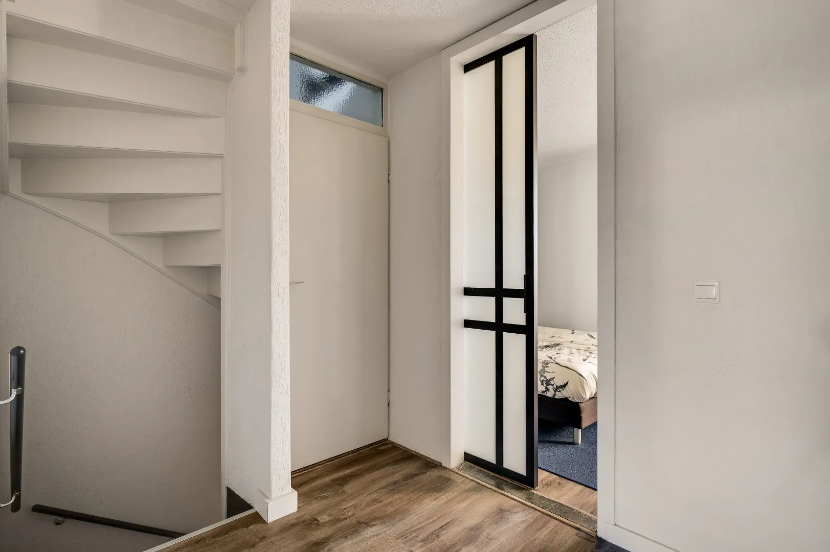 Makkelijk lopende trap naar de eveneens functionele ruime verdieping, nog ruimere overloop, de grootste slaapkamer over de gehele breedte van de woning aan de voorzijde met moderne stalen schuifdeur, heerlijk raam met dubbel glas en rolluiken.