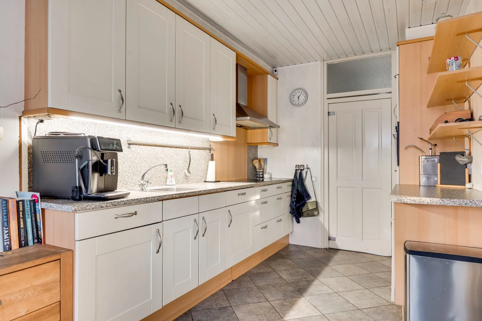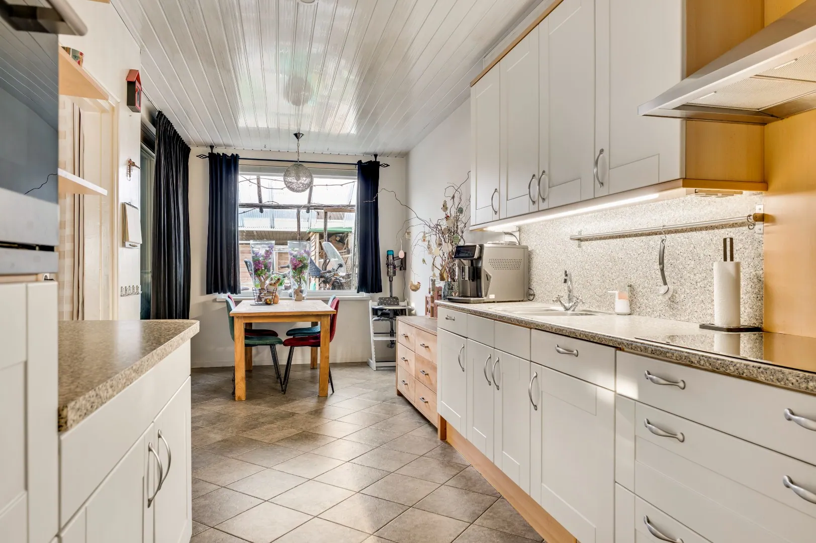 De leefkeuken is ook weer van een dermate afmeting dat hier voldoende ruimte is voor een tweede eetkamerset en v.v. div. apparatuur o.a.: keukenblok met diverse kasten, verlichting, inductie kookplaat 5 pits (2025), afz.kap, combi-magnetron, koelkast, aparte vrieskast en vaatwasser. (Dus echt compleet!).