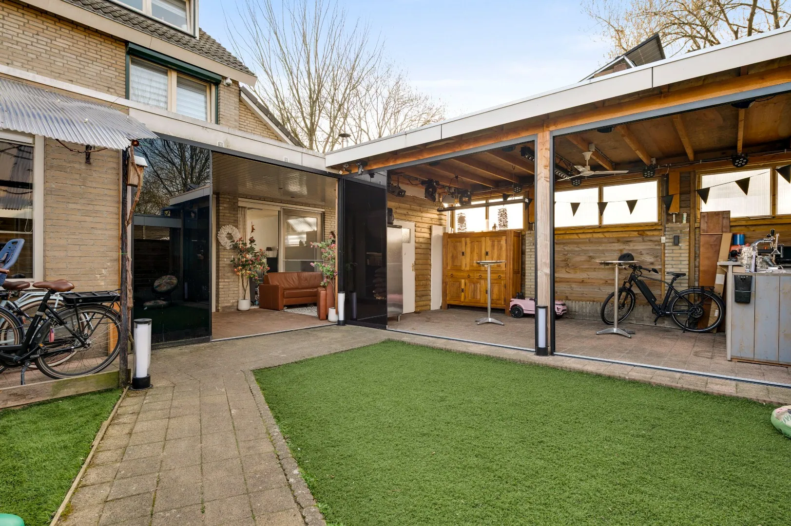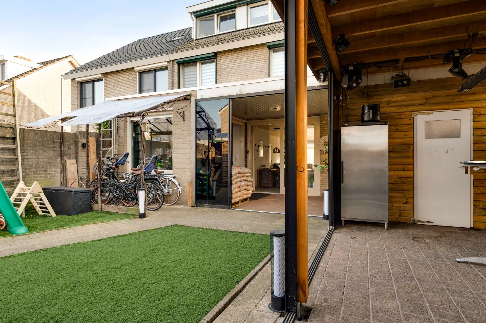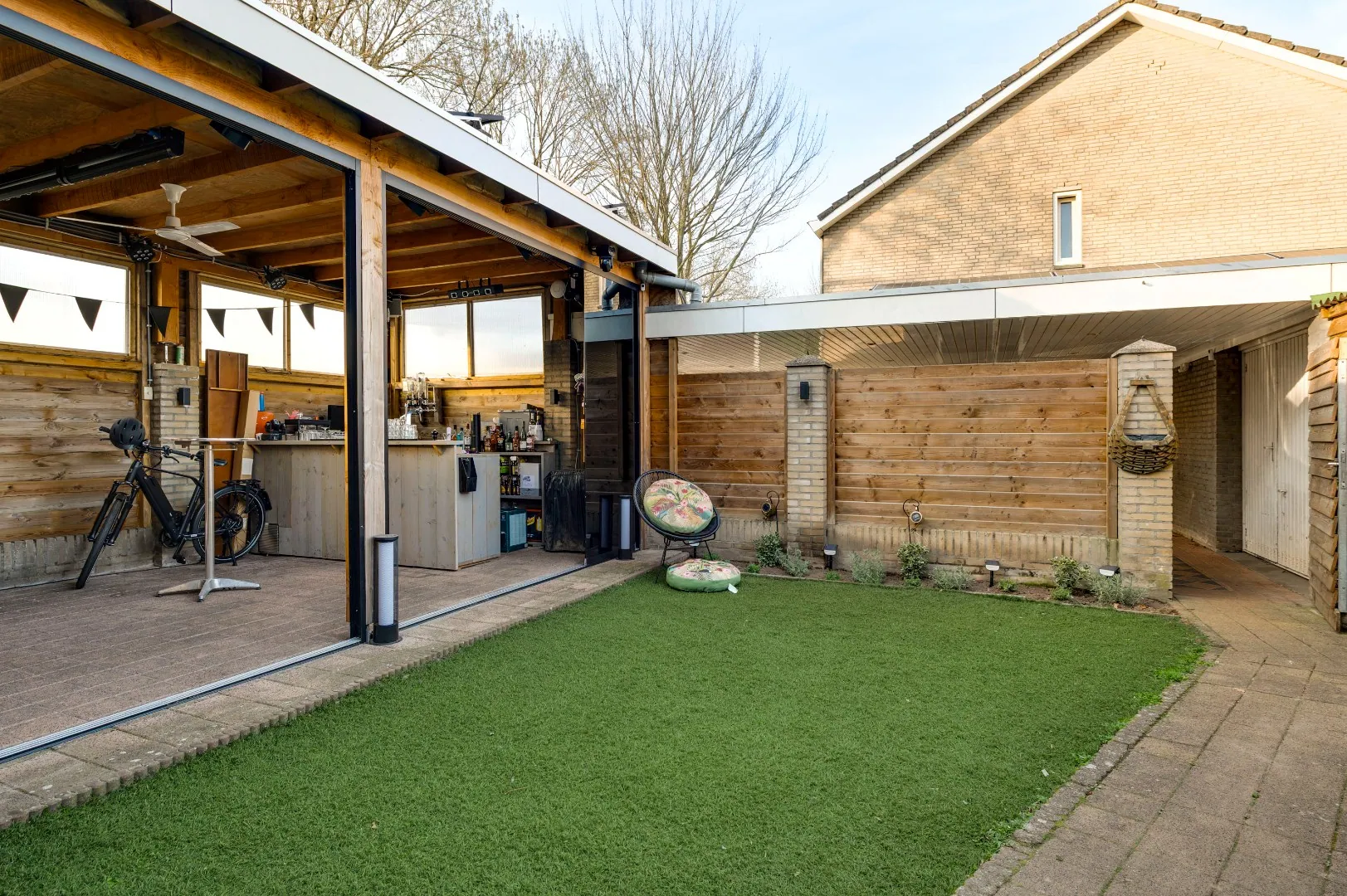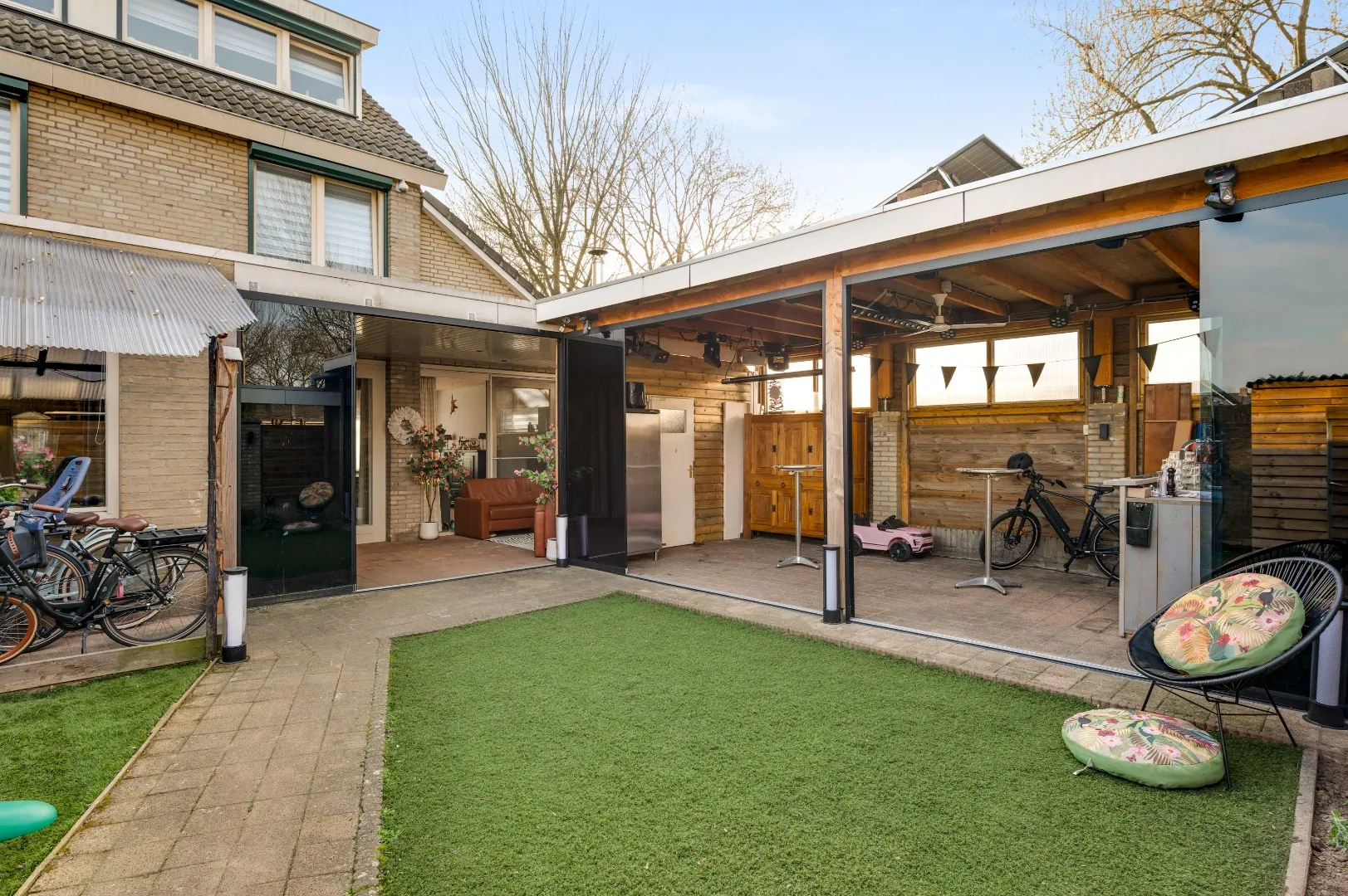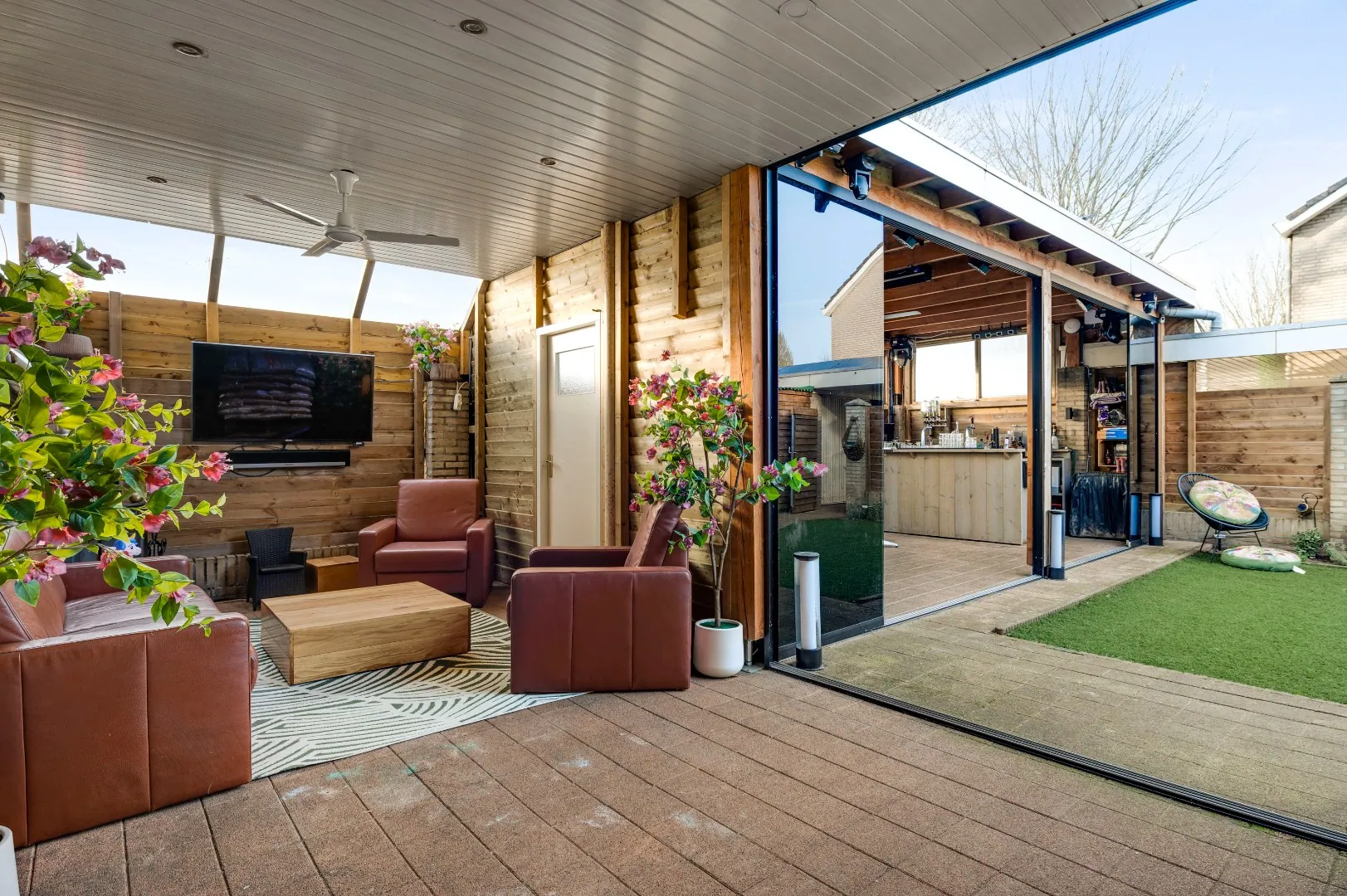 Super patio welke verruimd kan worden door de fantastische glazen puien waarbij zowel de serre alsmede het tuinpaviljoen bij de tuin kunnen worden getrokken.