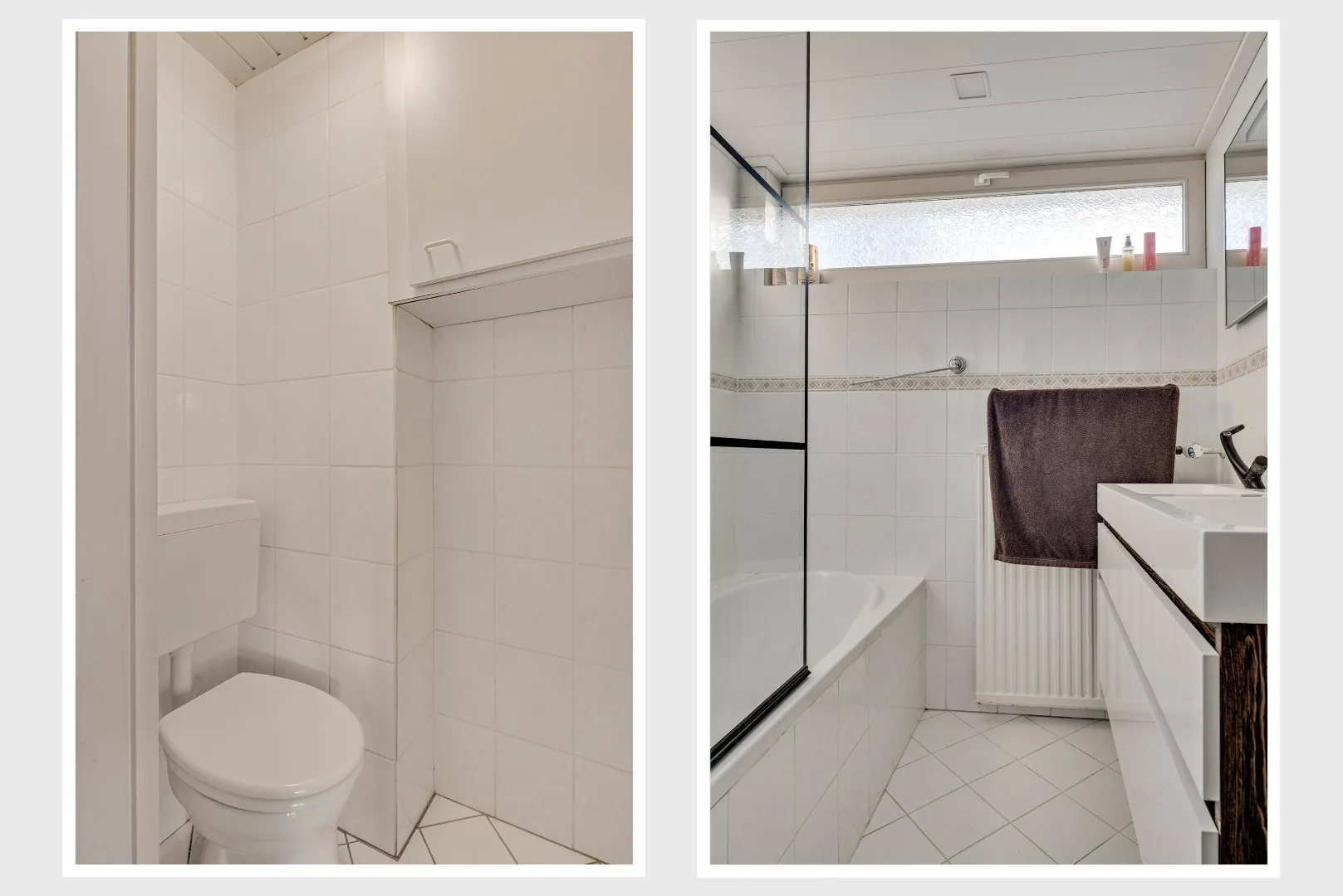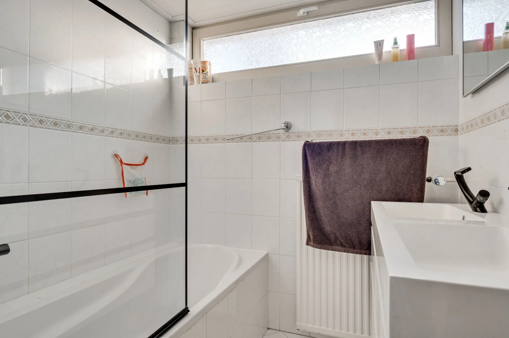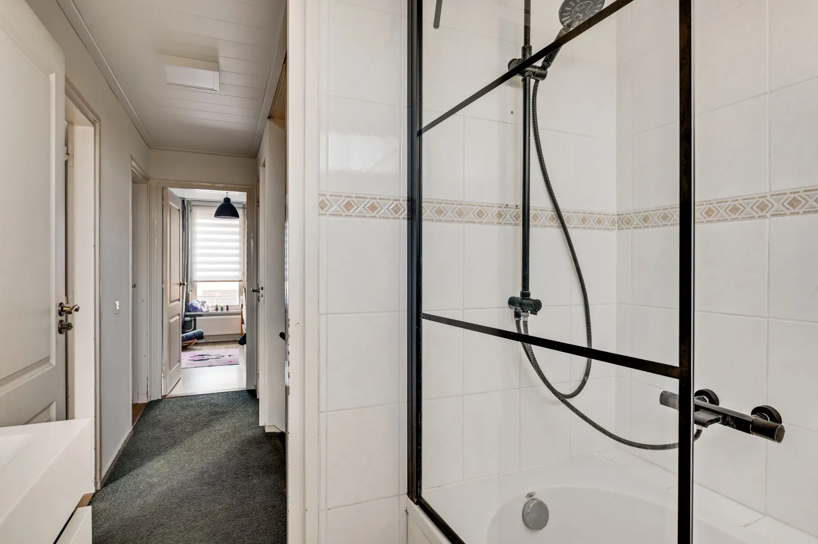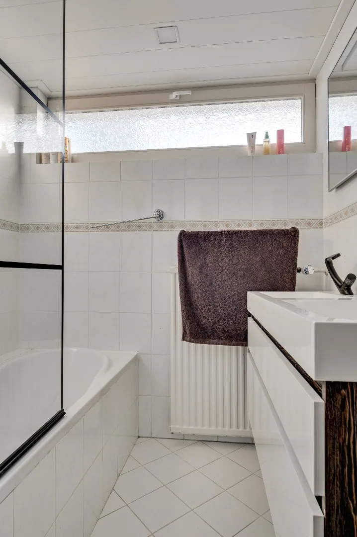 Overloop met separate toiletruimte, 3 heerlijke slaapkamers allen v.v. rolluiken, badkamer aan de voorzijde met riante inloopdouche, dubb. Wastafel en raam.