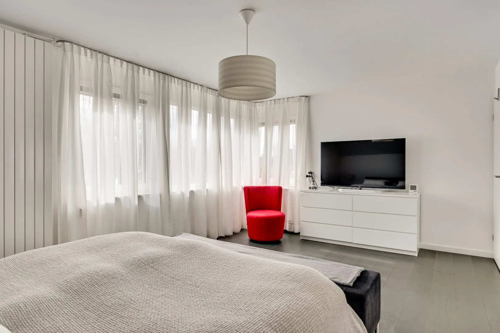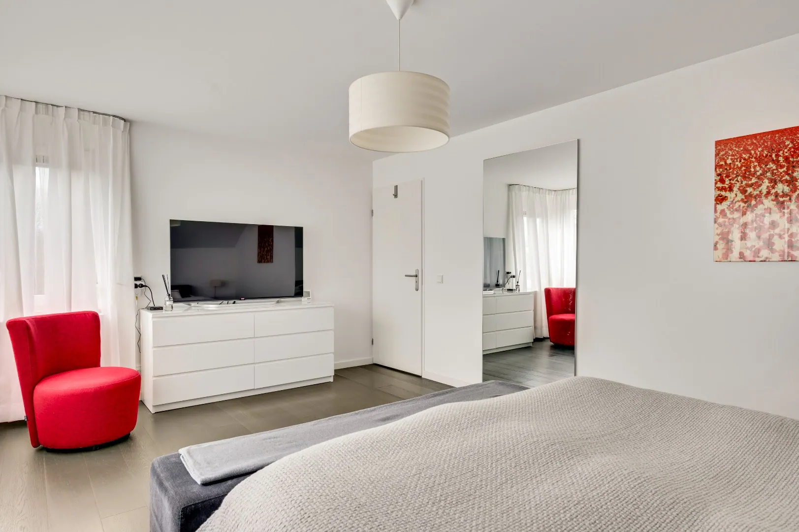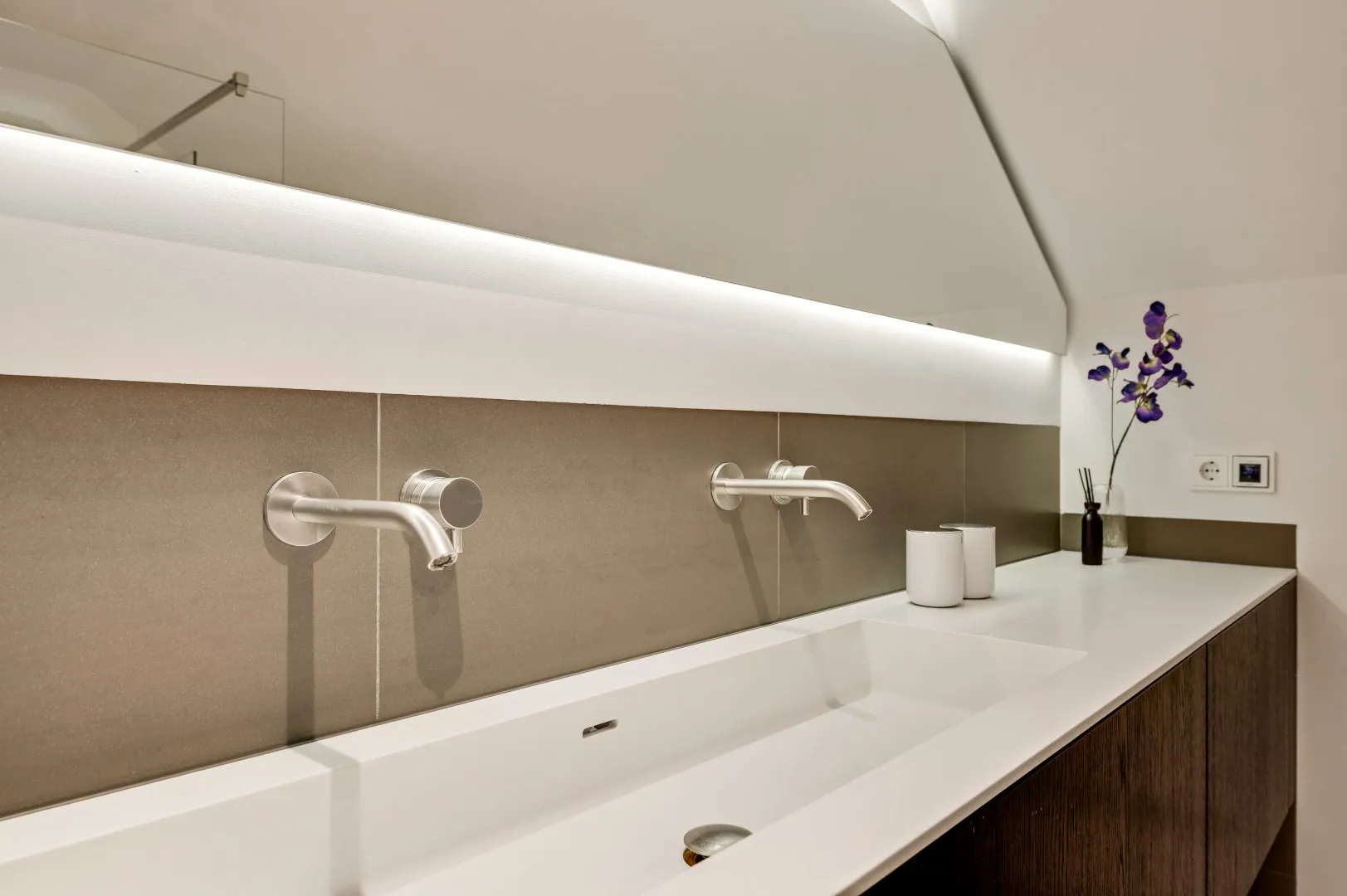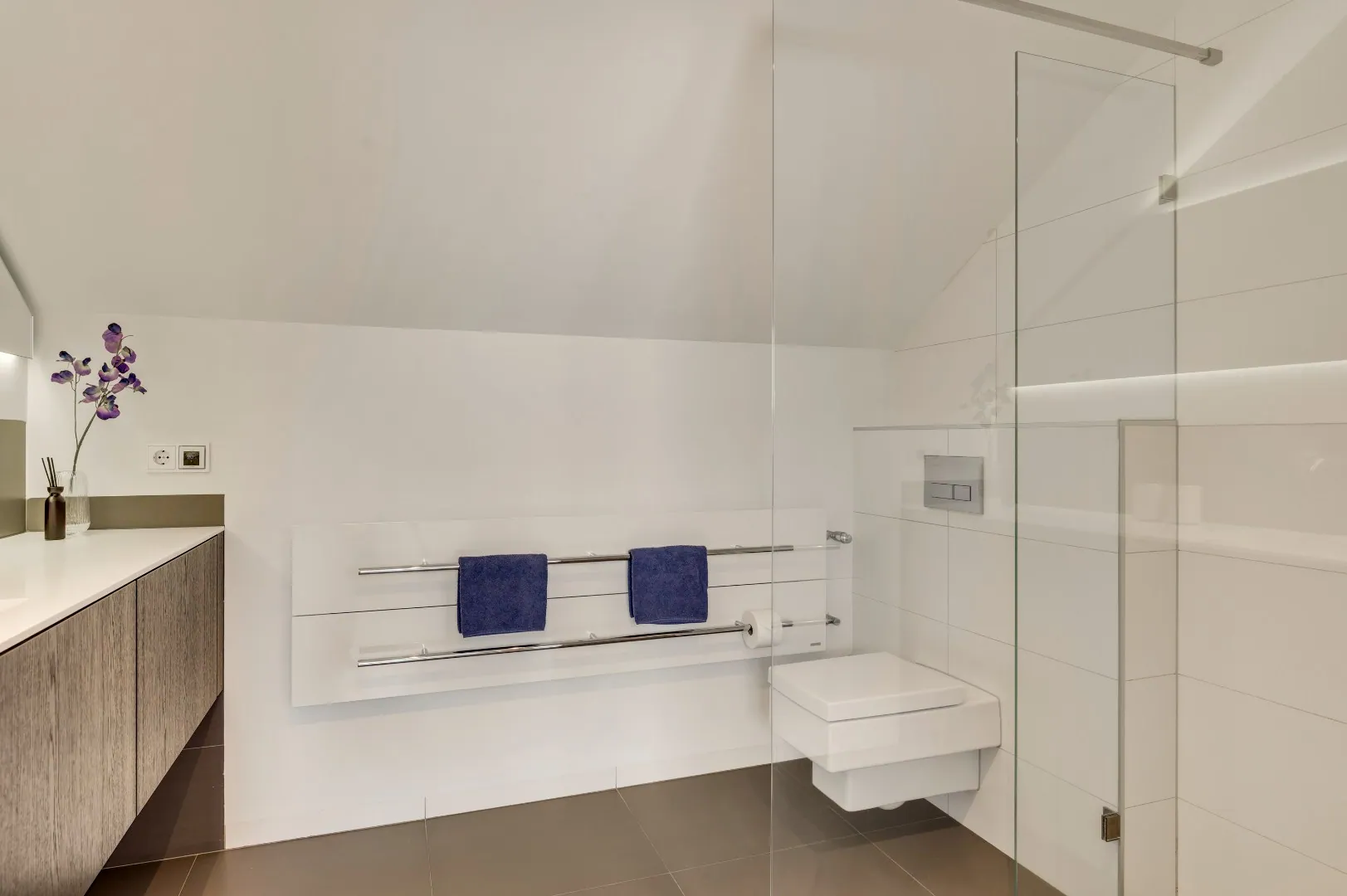 De mooie hardhouten trap brengt u naar de verdieping, v.v. prachtige plankenvloer, wederom ruimte ruimte ruimte, luxe badkamer (Hotel chique, must see), 3 slaapkamers, waarvan de kleinste kamer is omgetoverd tot inloopkastenkamer, en de ouderslaapkamer is aan de achterzijde gesitueerd, ook hier wordt RUIMTE met hoofdletters geschreven. Fantastische raampartij met extra hoekraam, airco en rolluiken.