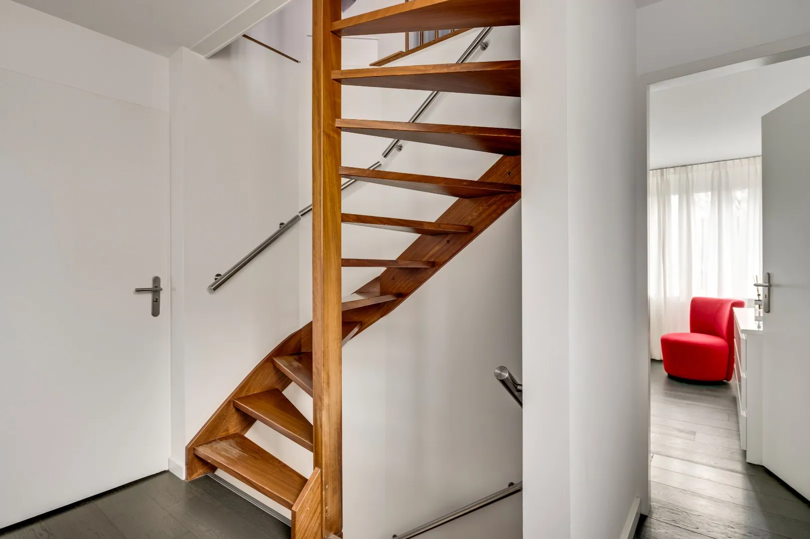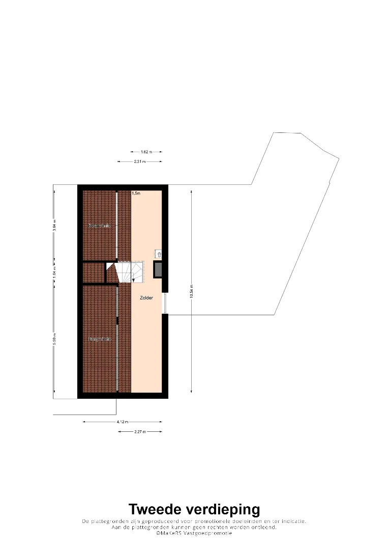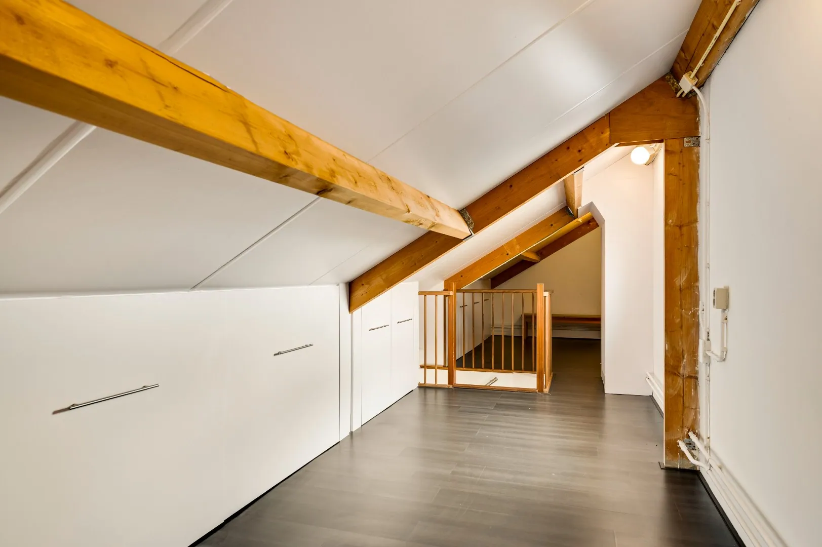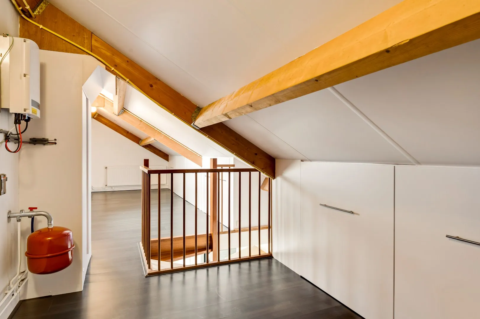 Vaste trap zolder (idem hardhout) naar extra ruimte v.v. kastenwanden, cv opstelling, omvormer en raam.