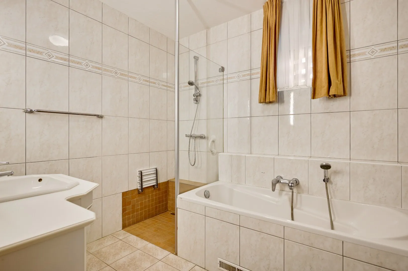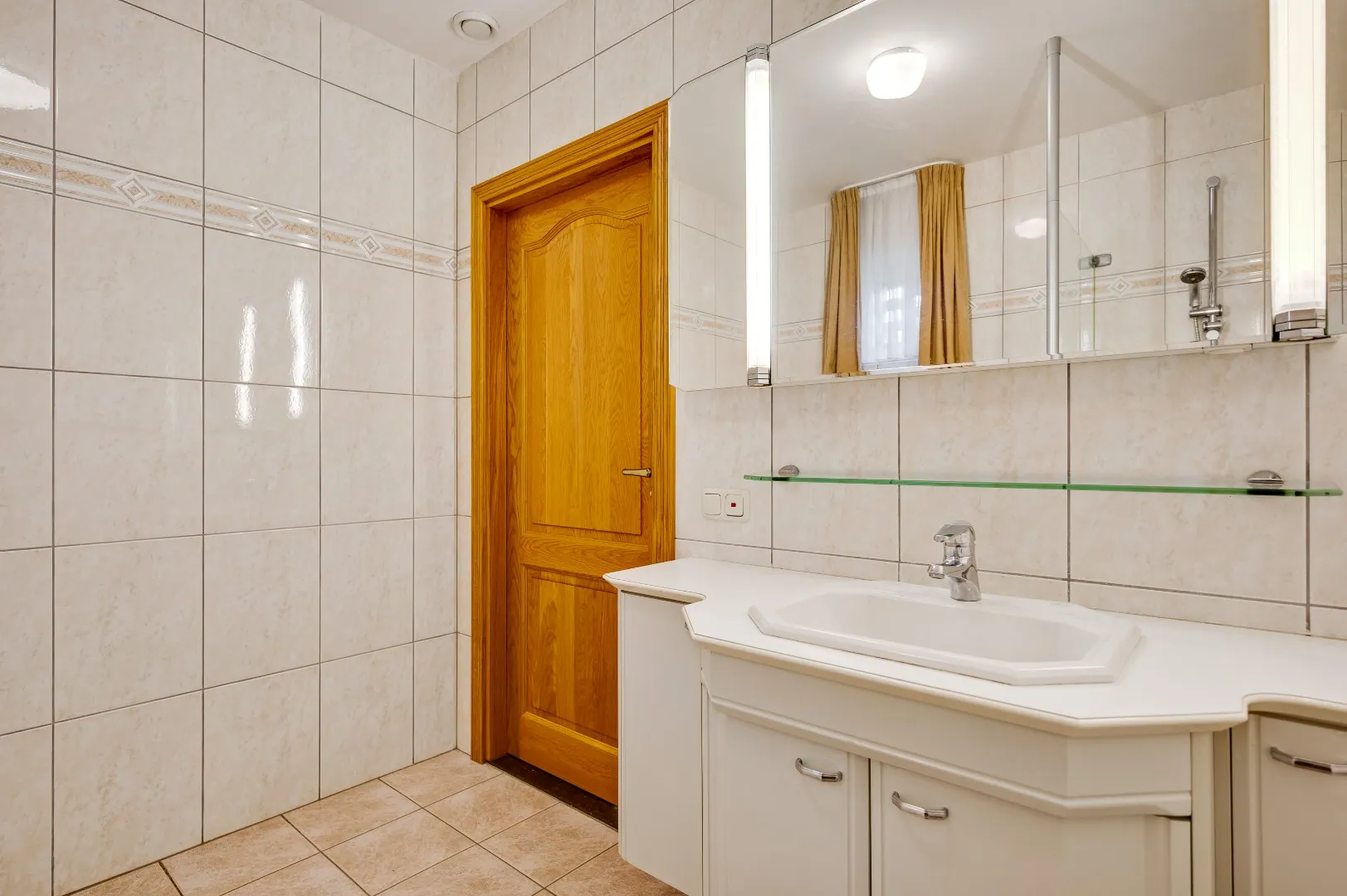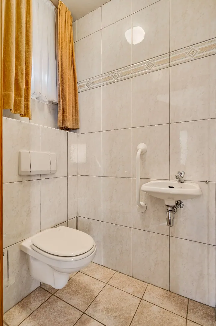 Uiteraard is hier ook nog een badkamer v.v. alle gemakken, o.a. douche, ligbad, extra toilet, dubbele wastafelcombinatie en groot raam.