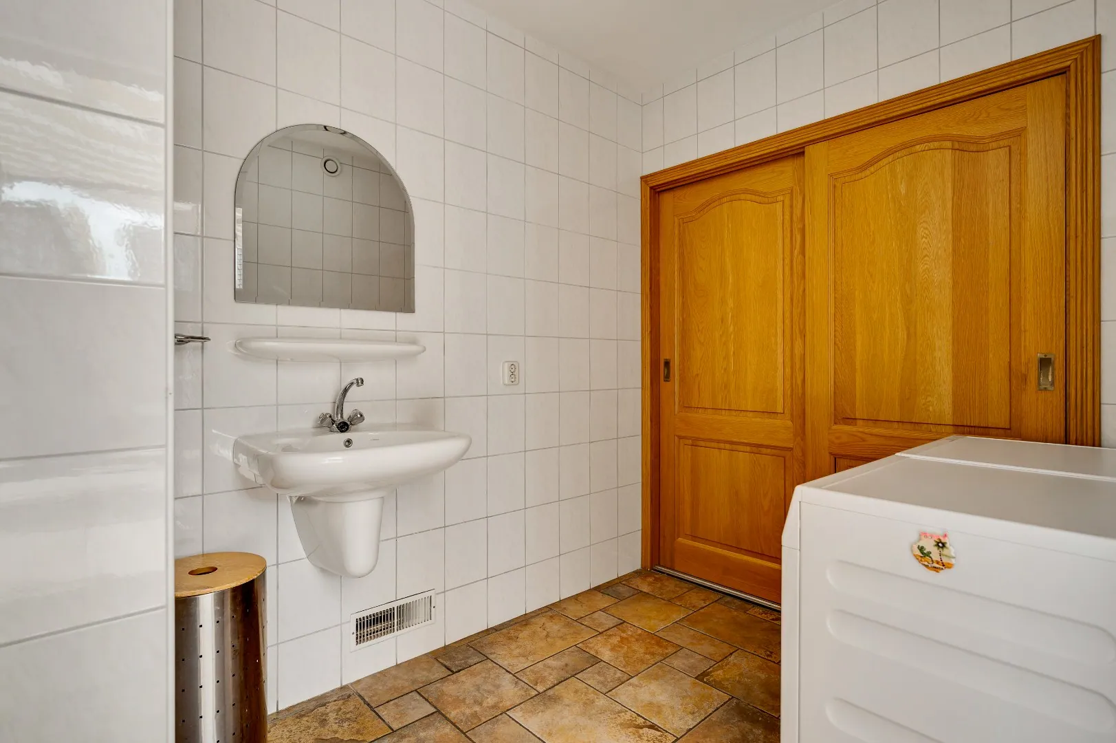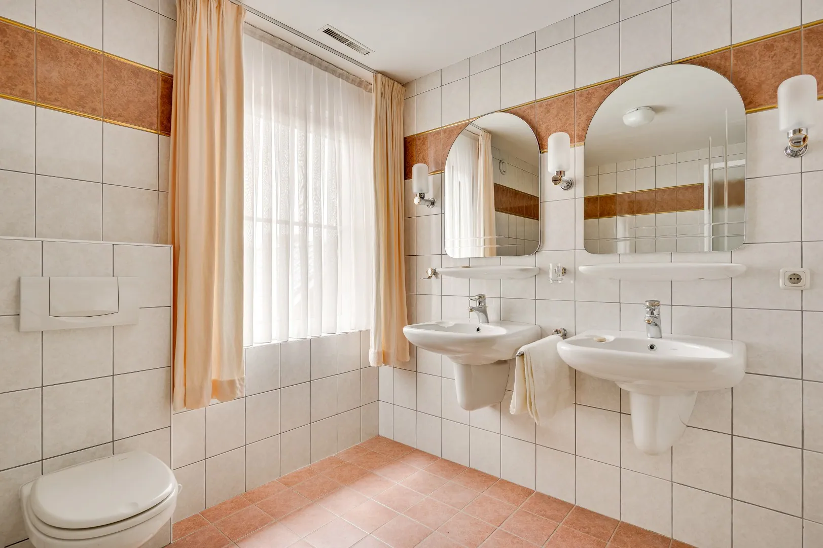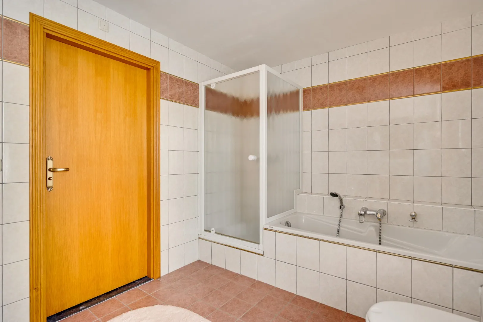 Uiteraard is hier ook nog een badkamer v.v. alle gemakken, o.a. douche, ligbad, extra toilet, dubbele wastafelcombinatie en groot raam.