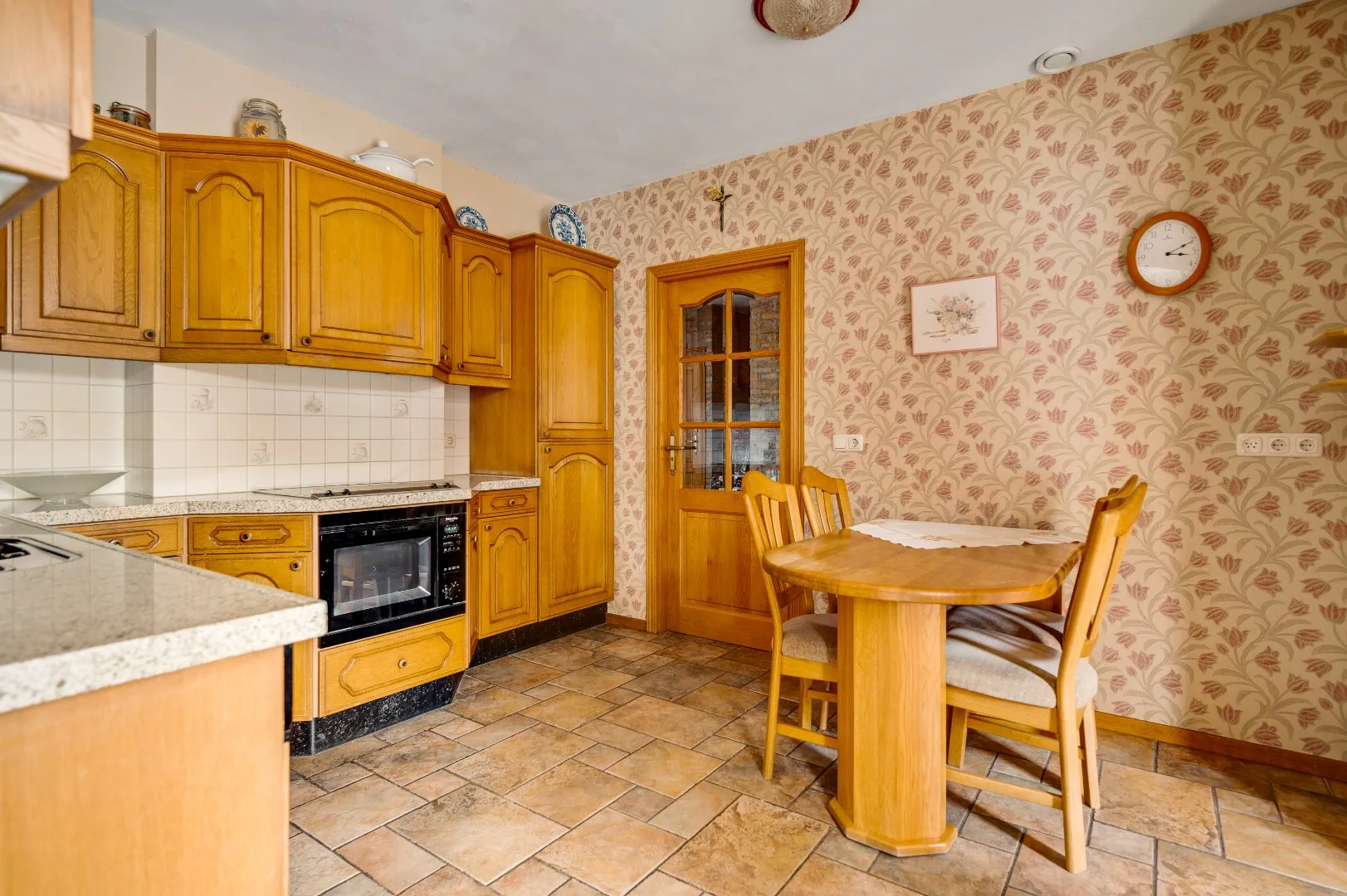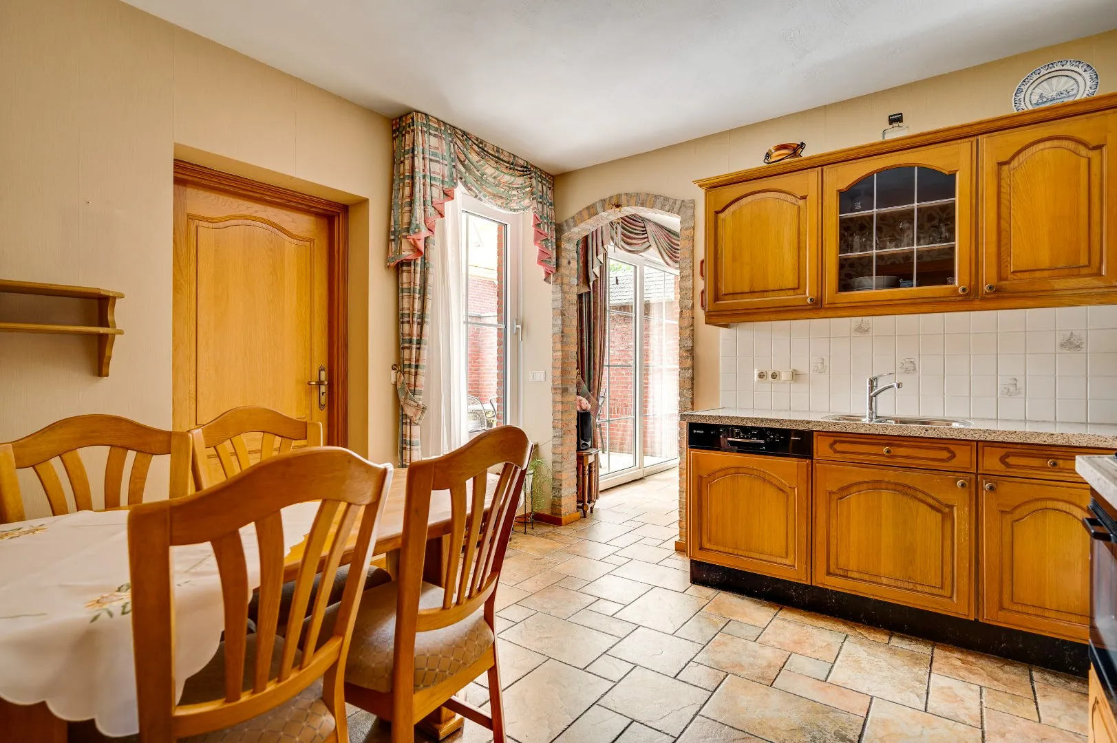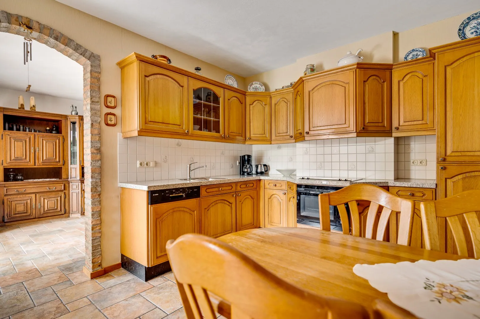 Keuken met degelijke Eiken hoekopstelling en toegang naar bijkeuken v.v. uitstortgootsteen, diverse aansl. wasm/droger en aparte achterom.