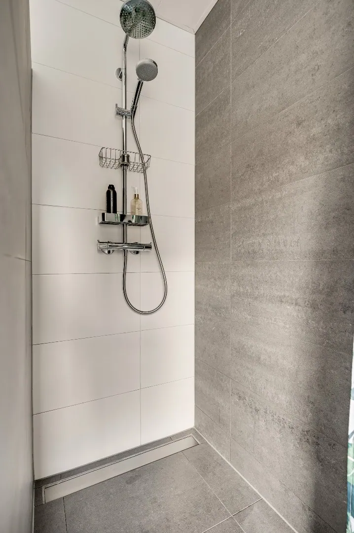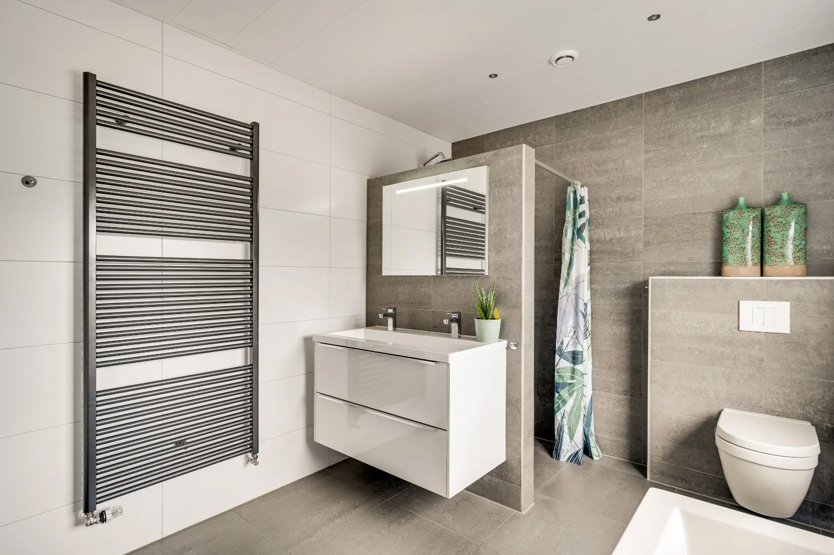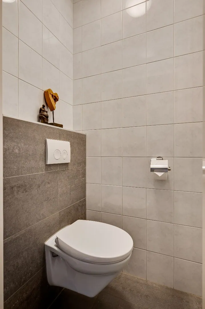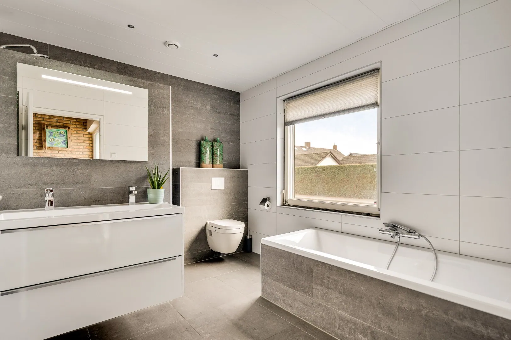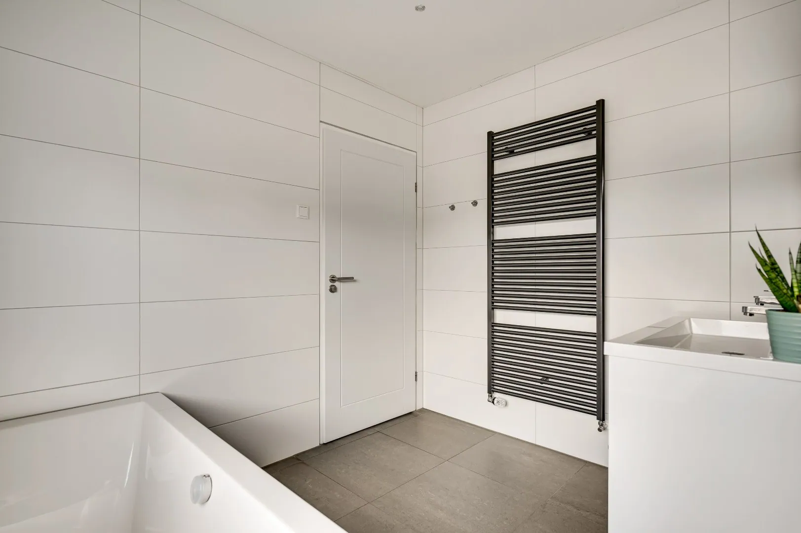 De ruime hal brengt u verder naar de luxe badkamer met groot ligbad, luxe hangcloset, zeer ruime inloopdouche en fraai gesitueerde badkamermeubel.