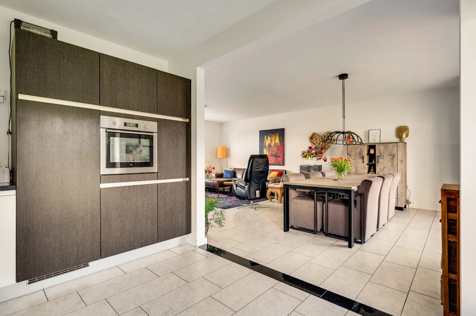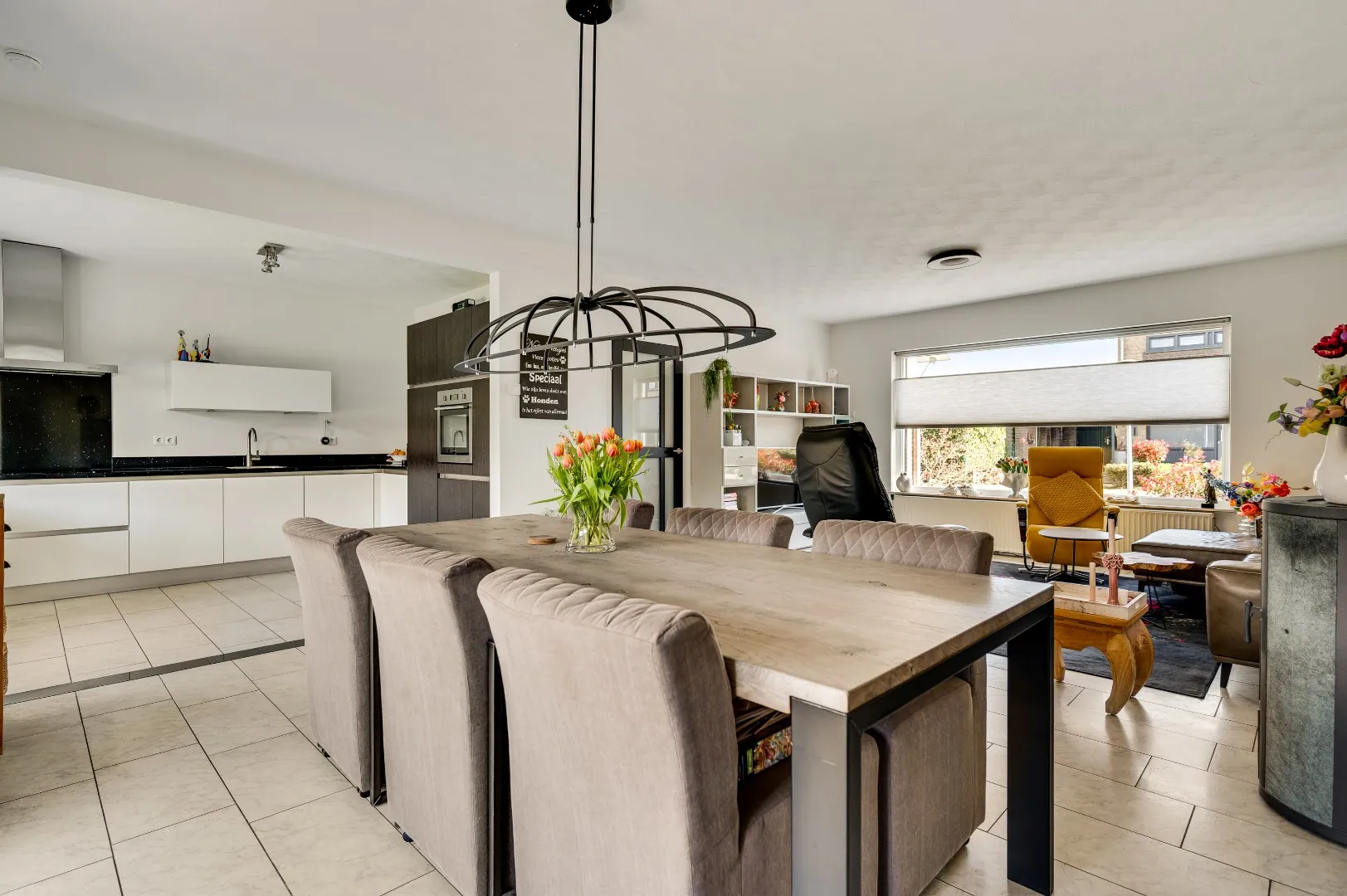 Doorgang naar heuse living ( 46 m2 incl. keuken ) met tegelvloer en vloerverwarming welke doorloopt in de woonkamer, keuken en deels de hal.