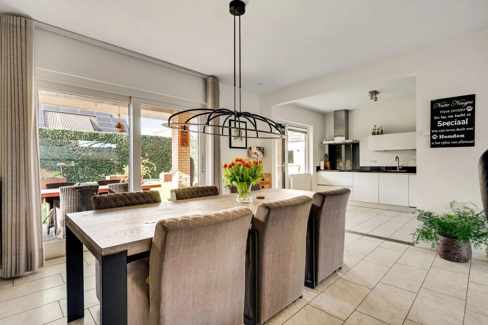 Heerlijke schuifpui welke de woonkamer direct verbindt met de overkapping en vrije achtertuin met eigen groene hagen en borders en tuinpaviljoen.